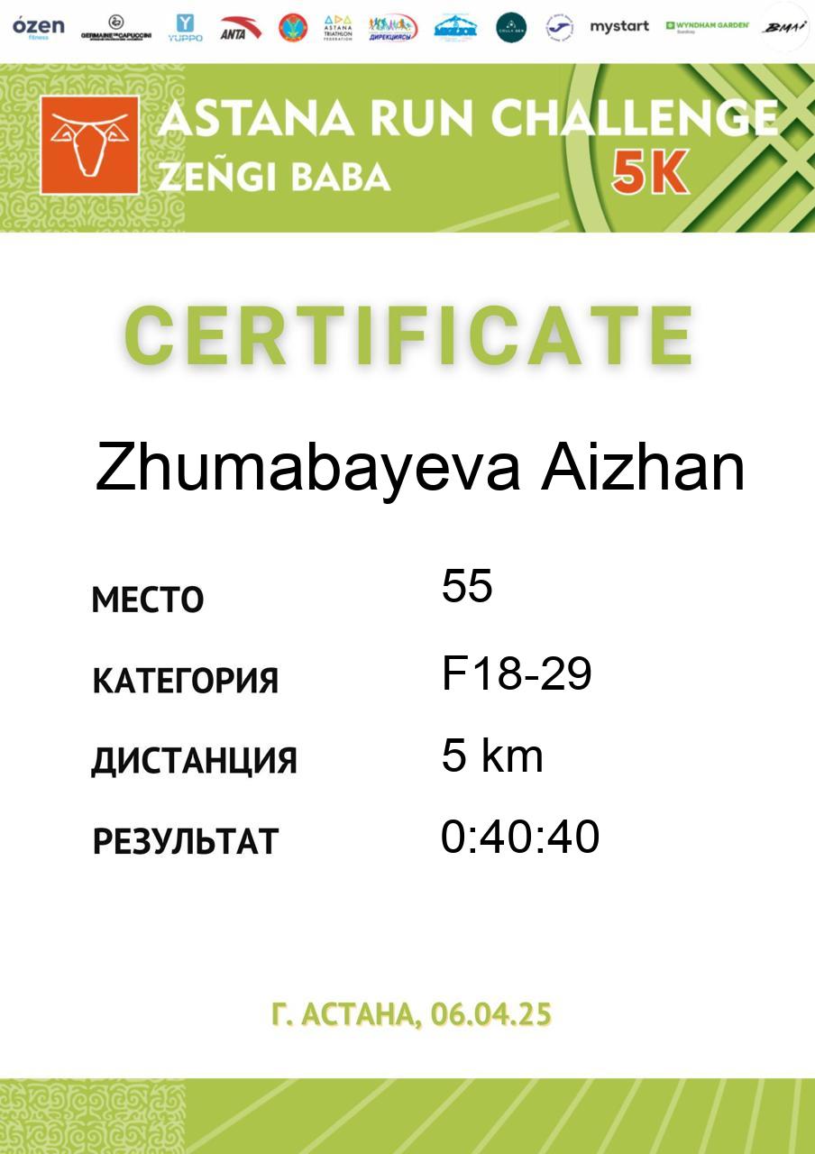 | 55 | Zhumabayeva Aizhan | 797 | F18-29 | 5 km | 0:40:40 | 786 | Жүктеу |