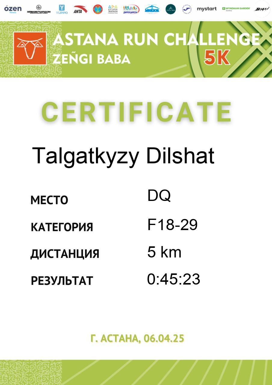 | DQ | Talgatkyzy Dilshat | 683 | F18-29 | 5 km | 0:45:23 | 820 | Жүктеу |