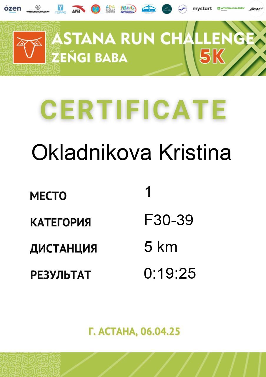 | 1 | Okladnikova Kristina | 548 | F30-39 | 5 km | 0:19:25 | 33 | Жүктеу |