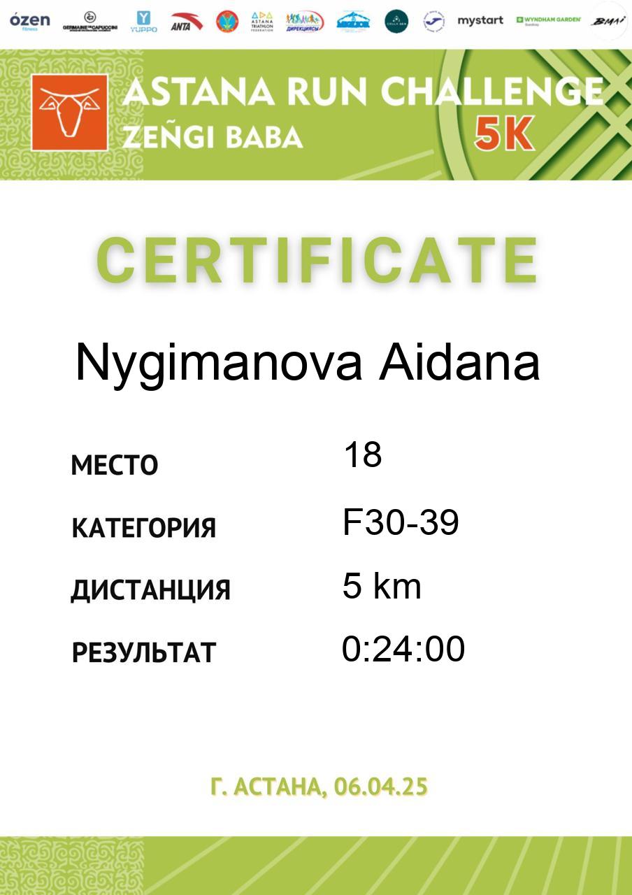 | 18 | Nygimanova Aidana | 546 | F30-39 | 5 km | 0:24:00 | 196 | Жүктеу |