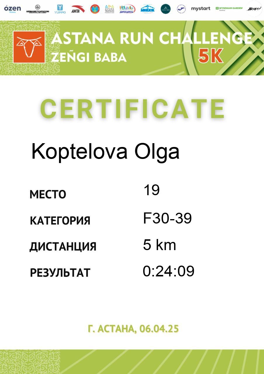 | 19 | Koptelova Olga | 397 | F30-39 | 5 km | 0:24:09 | 202 | Жүктеу |