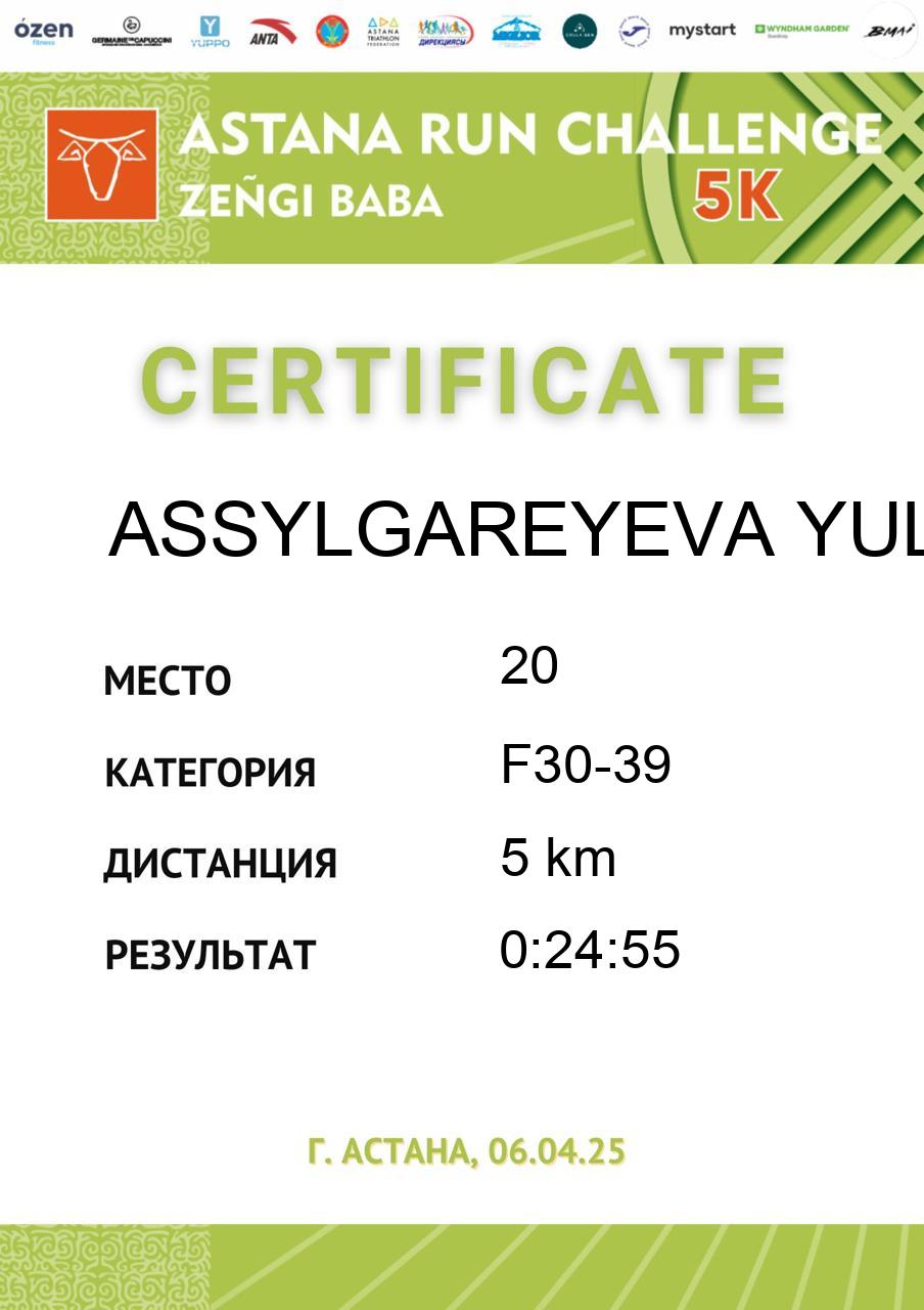 | 20 | ASSYLGAREYEVA YULIYA | 99 | F30-39 | 5 km | 0:24:55 | 233 | Жүктеу |