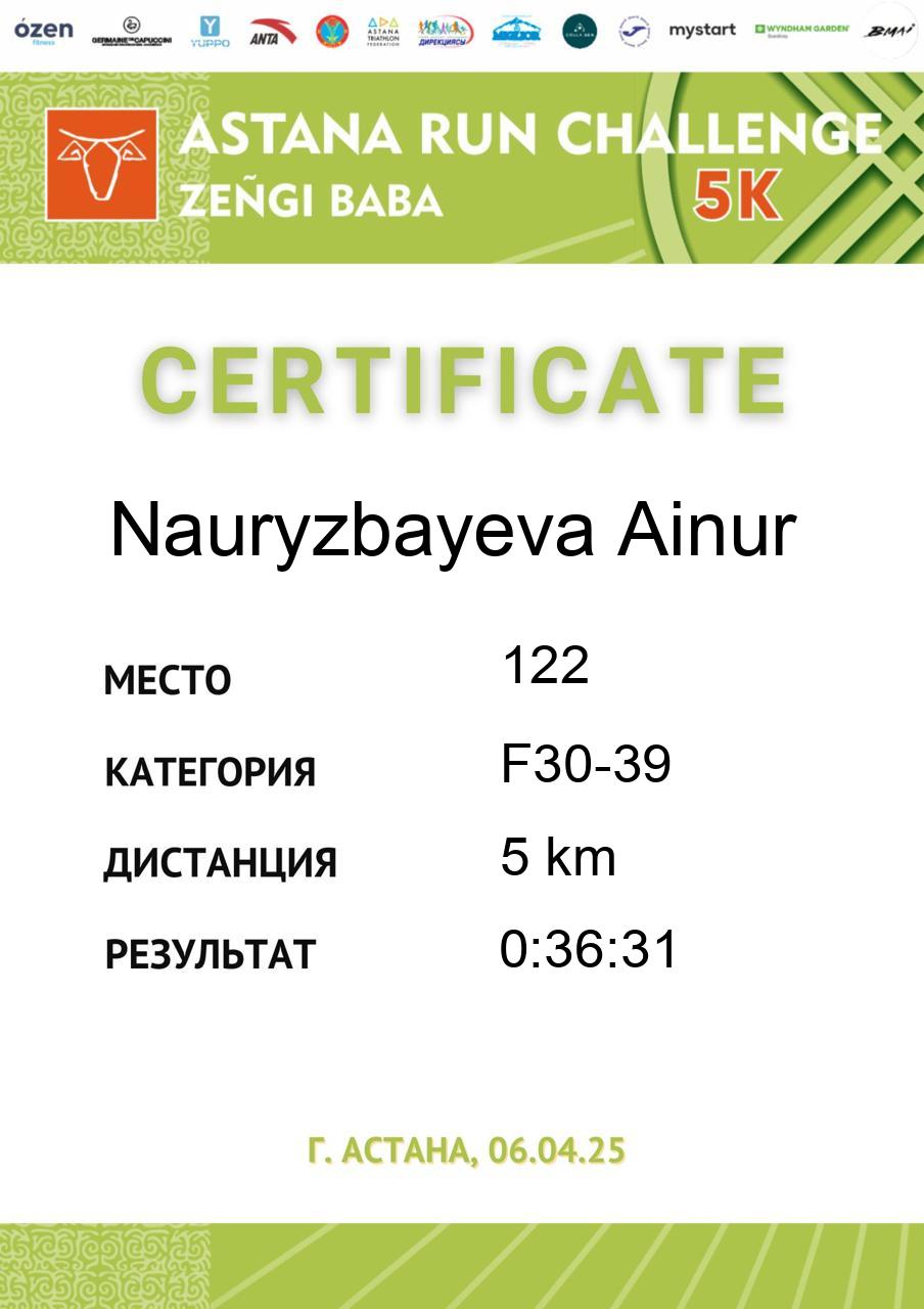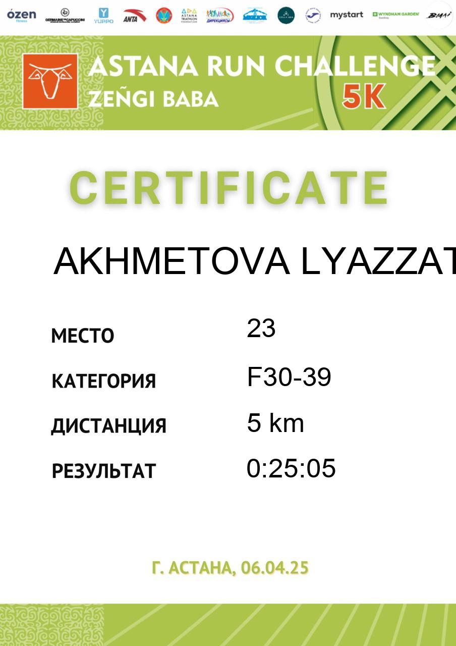 | 12 | Bazarbekkyzy Altynai | 146 | F30-39 | 5 km | 0:23:07 | 157 | Жүктеу |