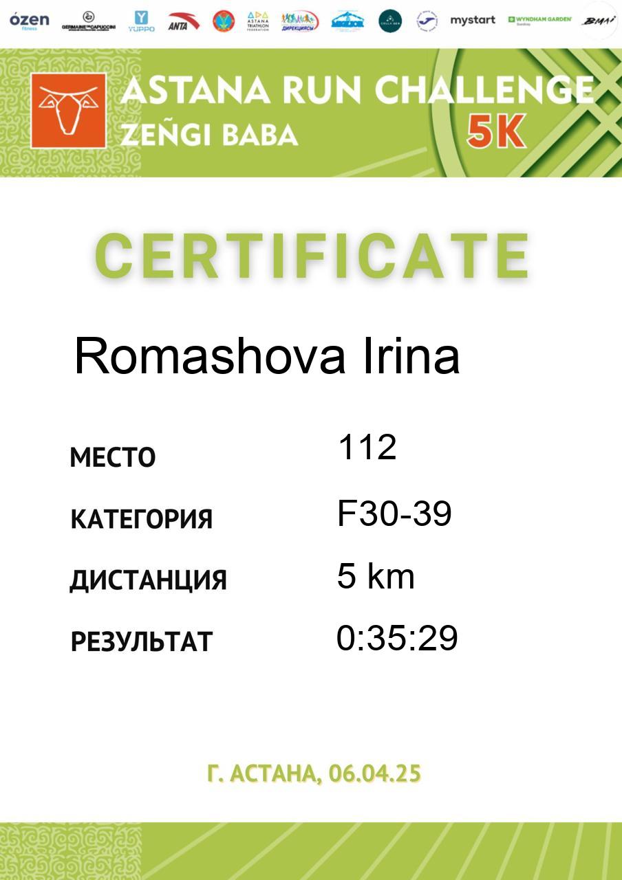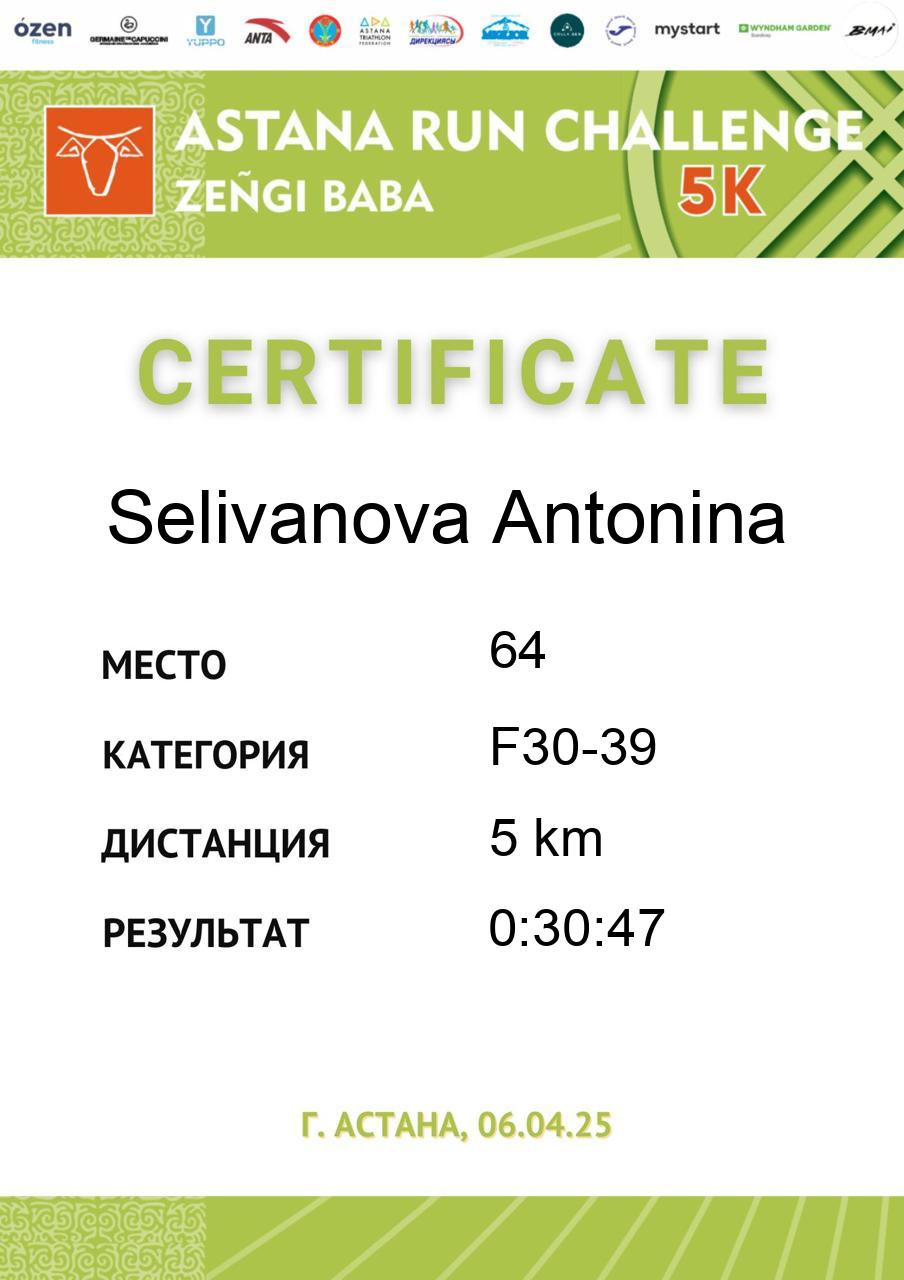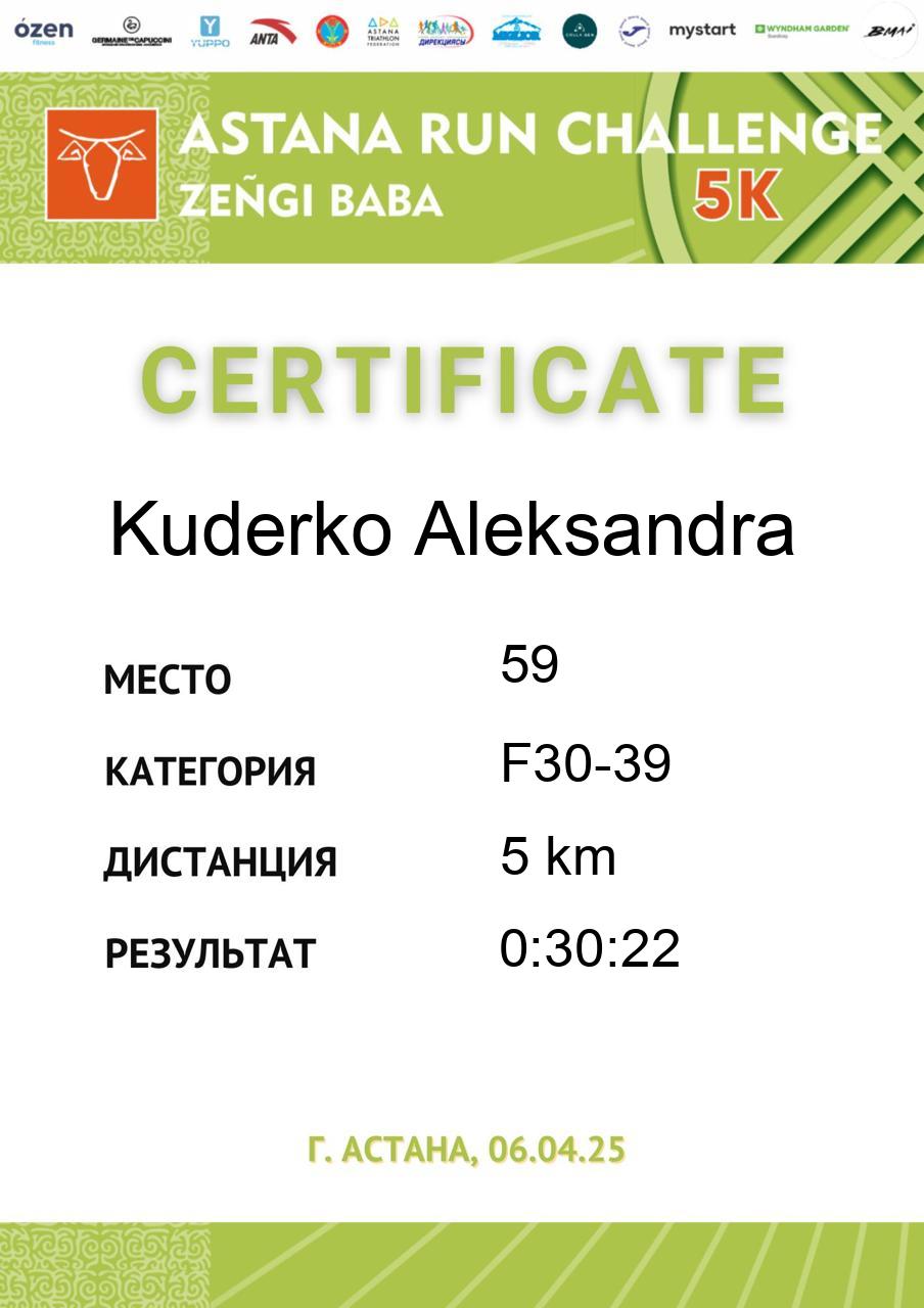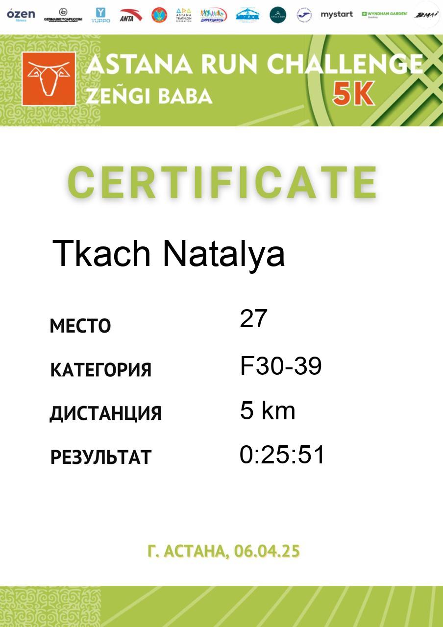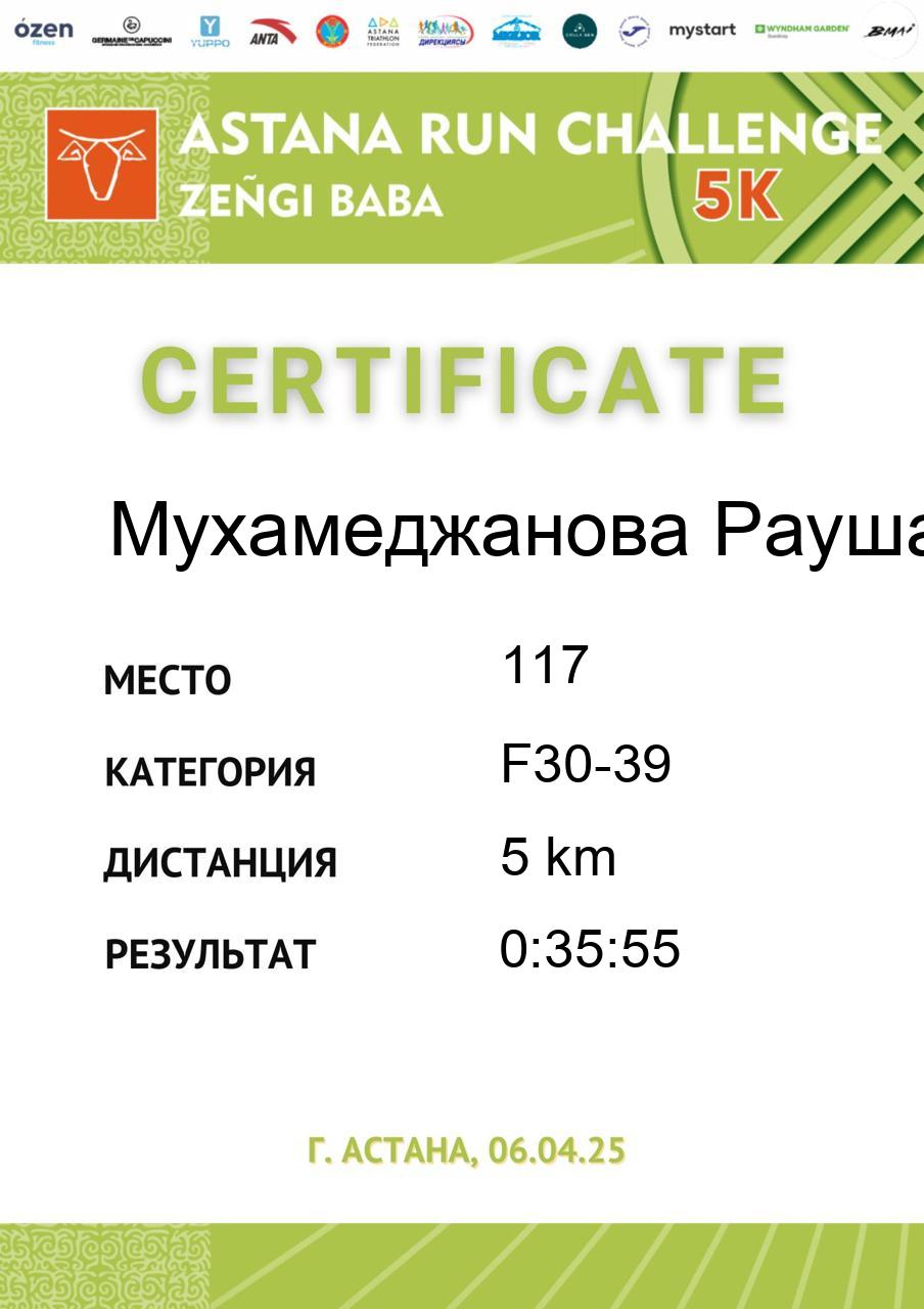 | 8 | Tokhanova Marzhan | 703 | F30-39 | 5 km | 0:21:50 | 96 | Жүктеу |