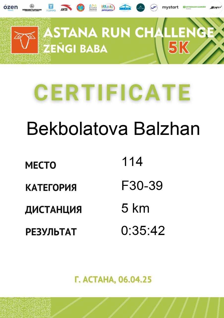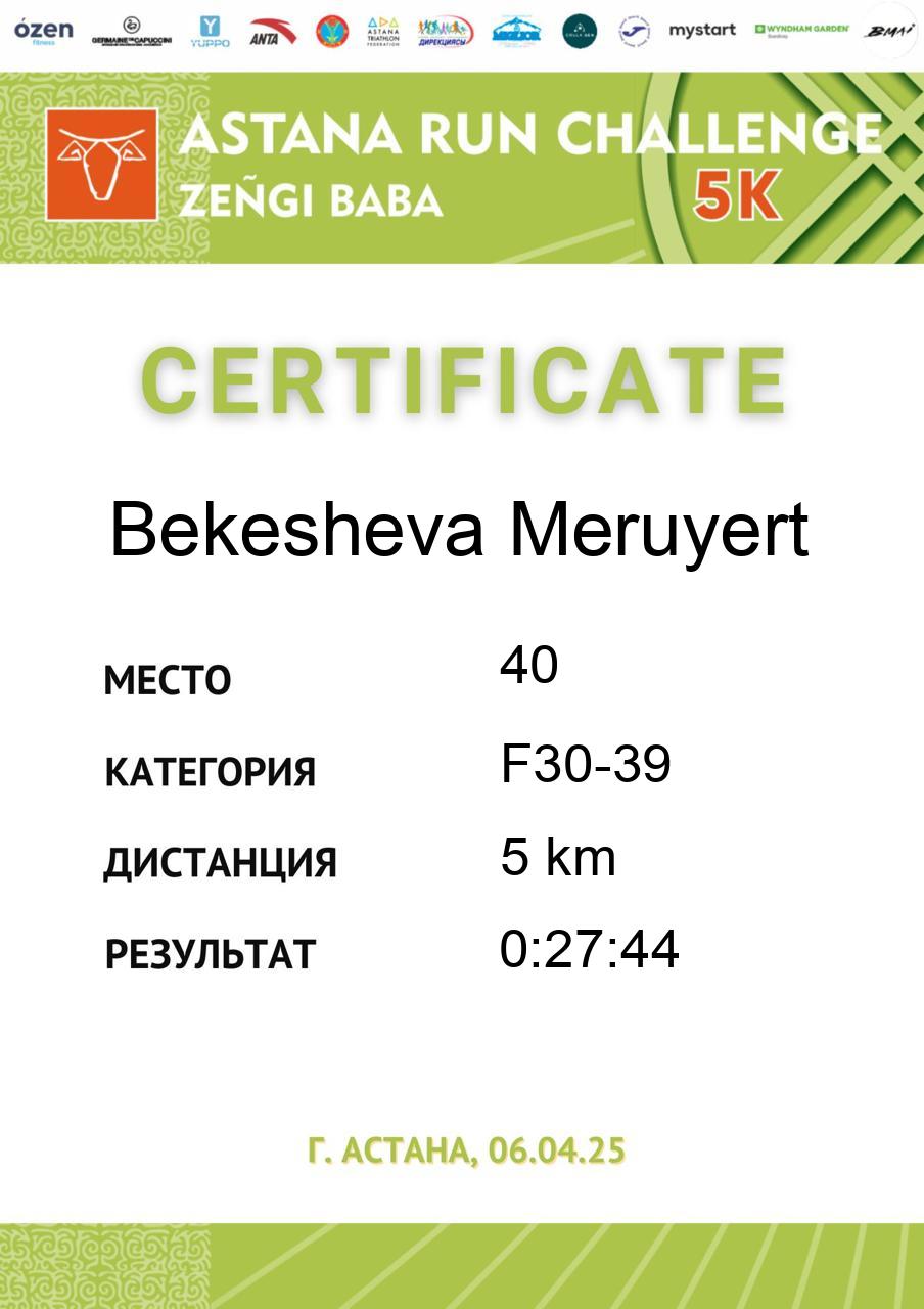 | 5 | Bekeyeva Aikorkem | 165 | F30-39 | 5 km | 0:21:18 | 81 | Жүктеу |