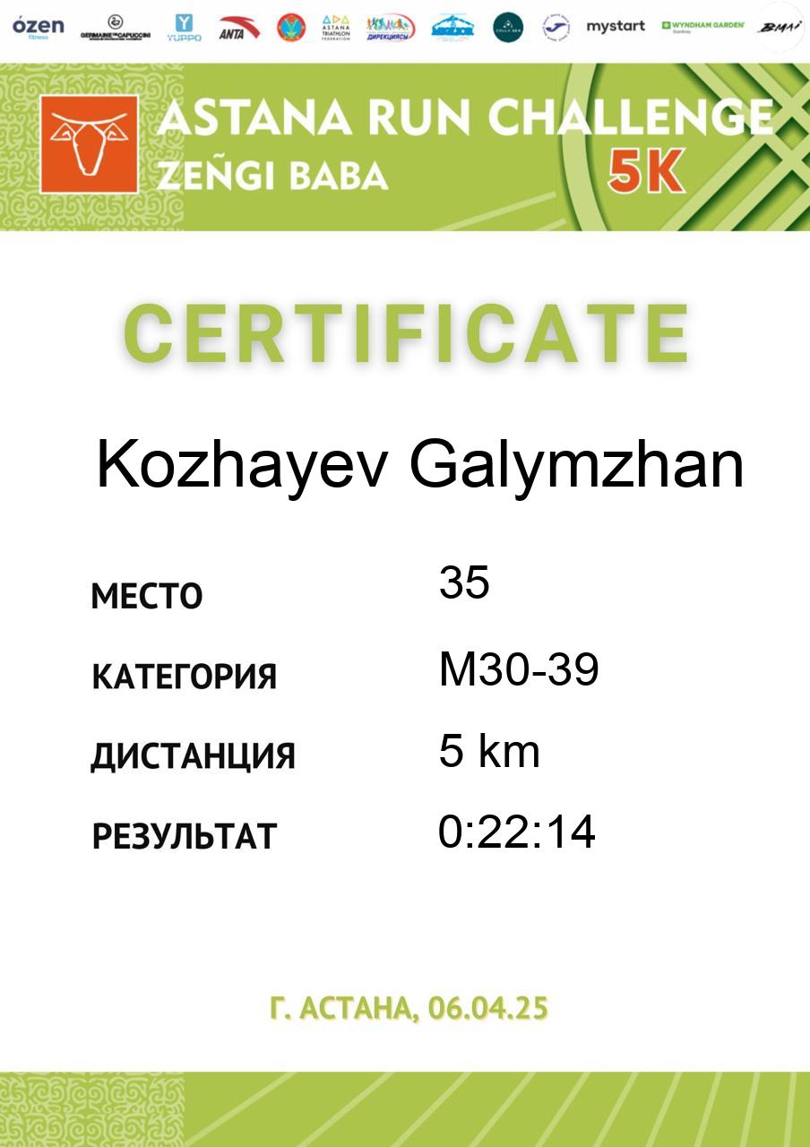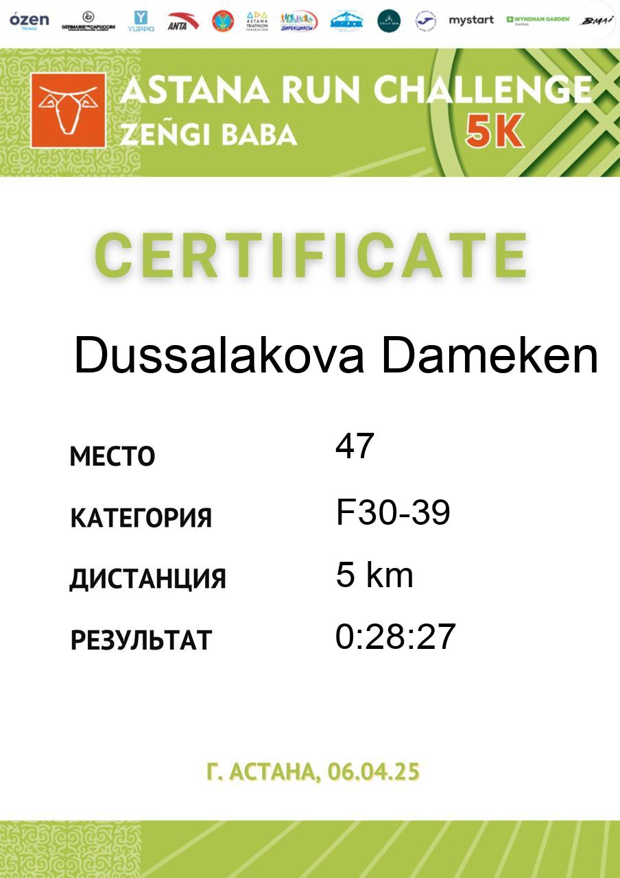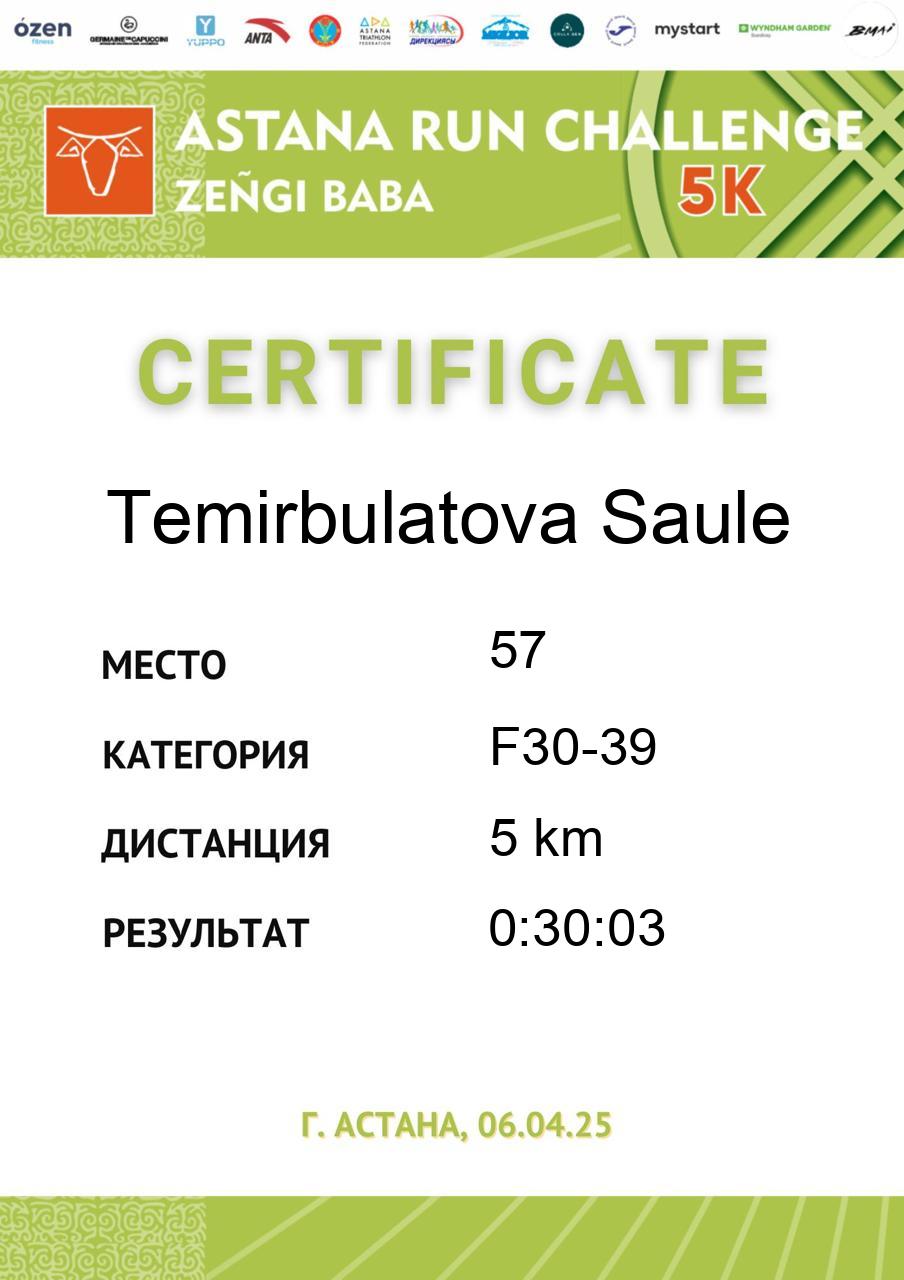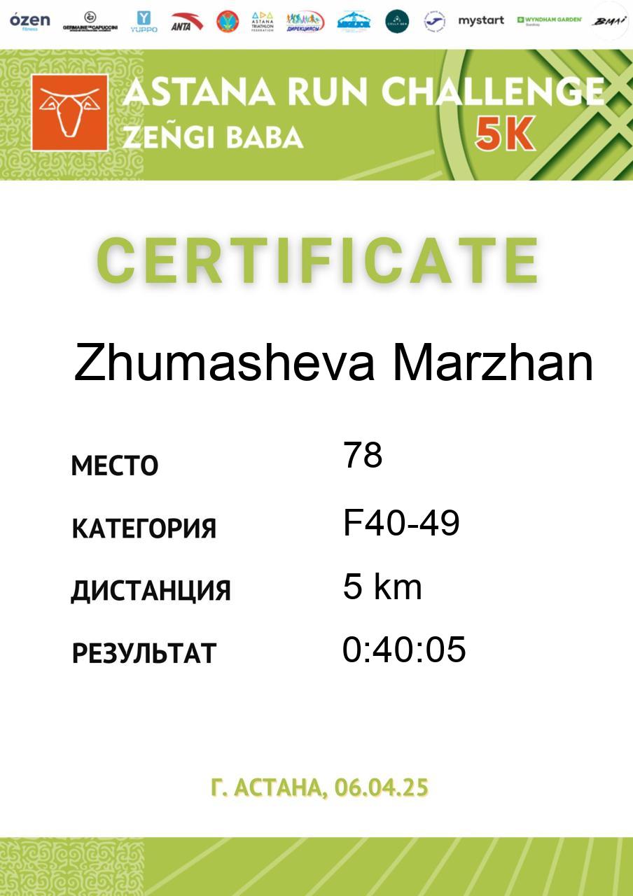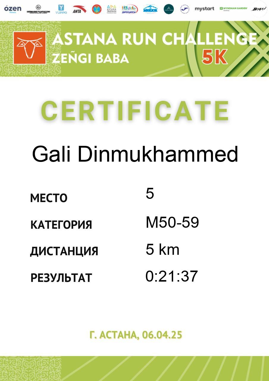 | 5 | Gali Dinmukhammed | 255 | M50-59 | 5 km | 0:21:37 | 91 | Жүктеу |