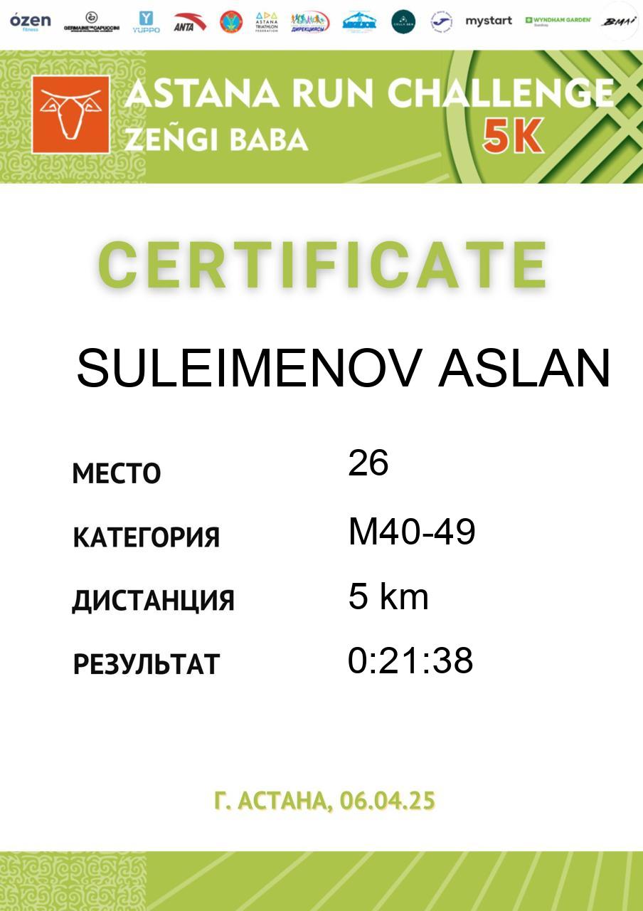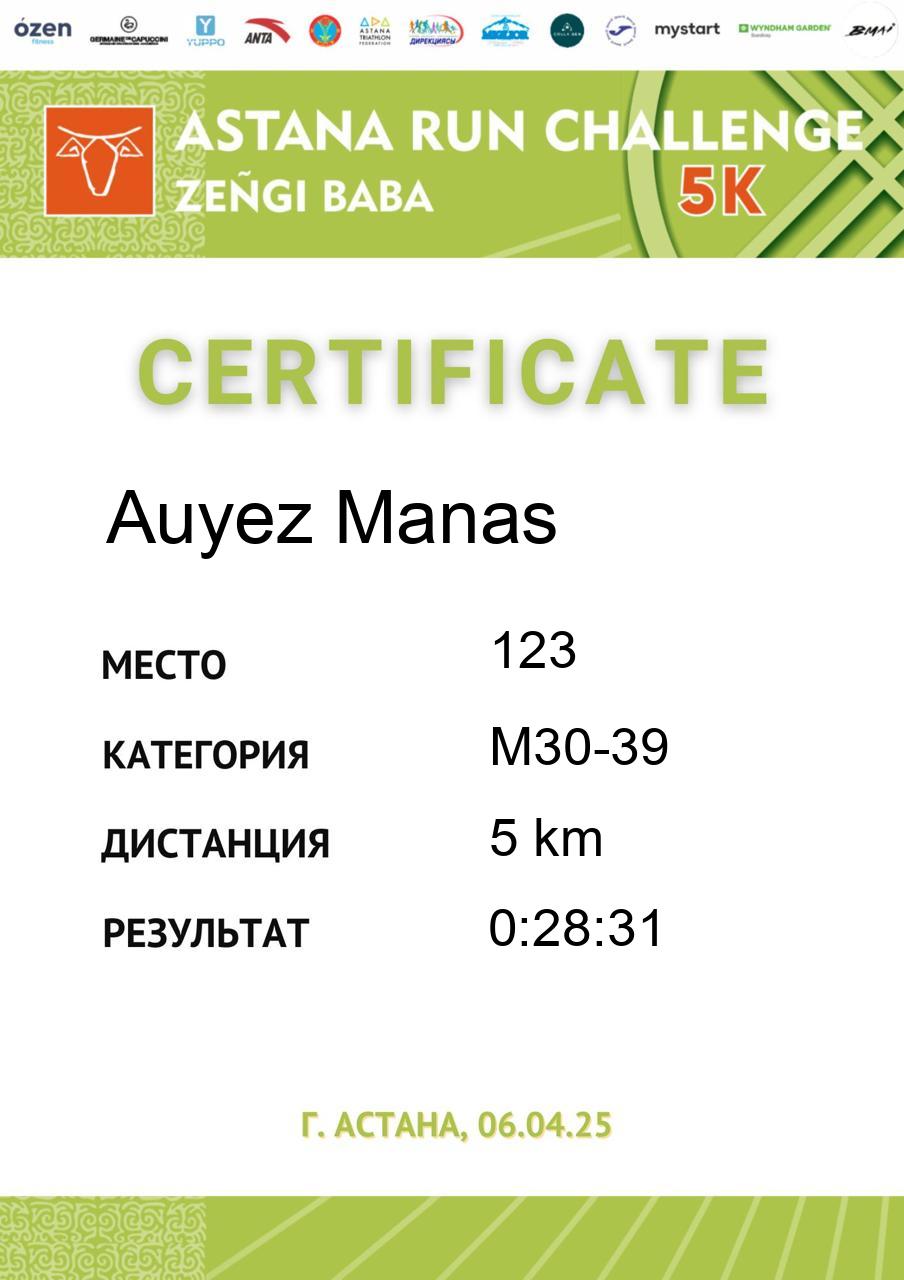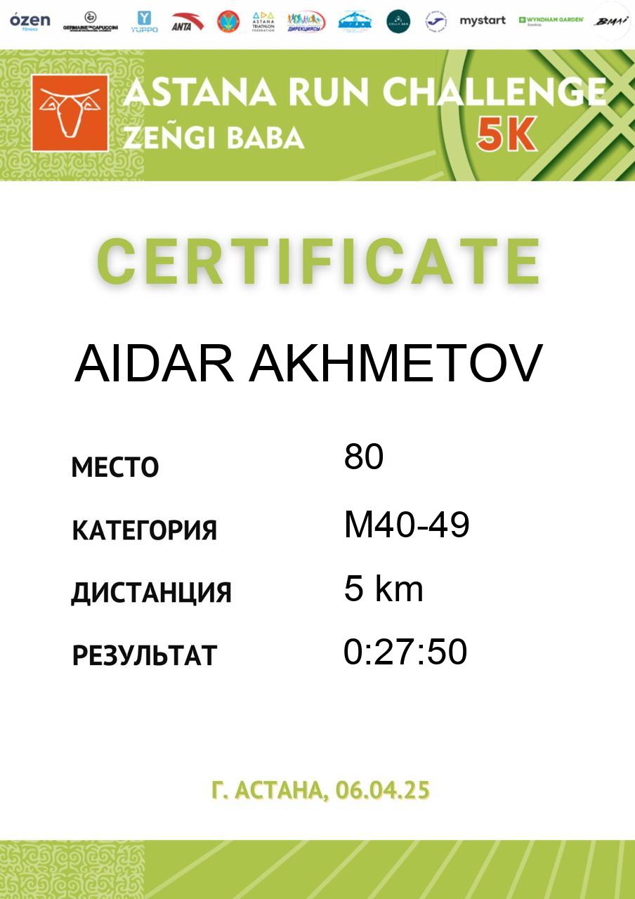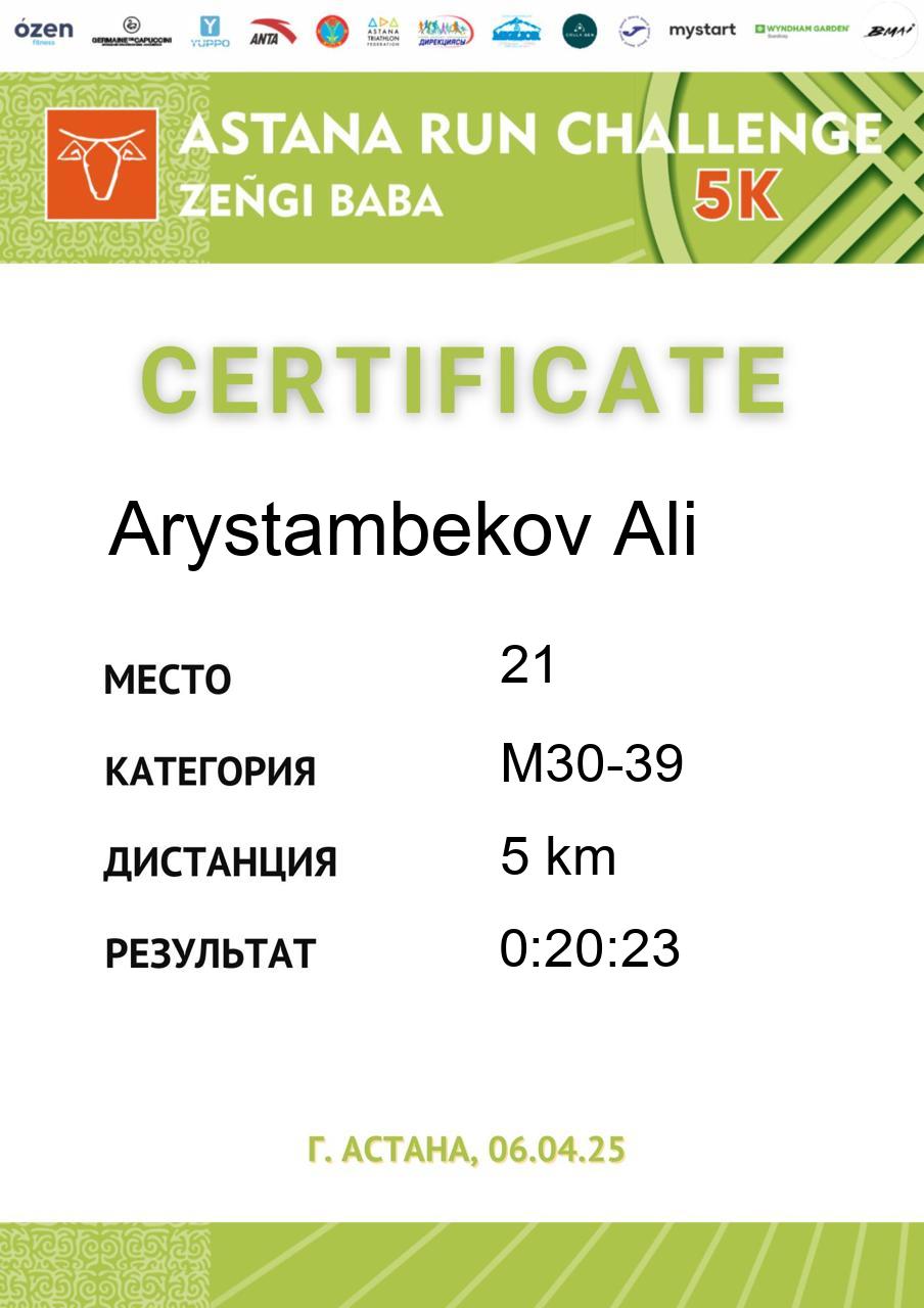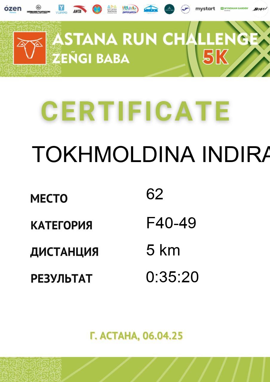 | 5 | Gali Dinmukhammed | 255 | M50-59 | 5 km | 0:21:37 | 91 | Жүктеу |