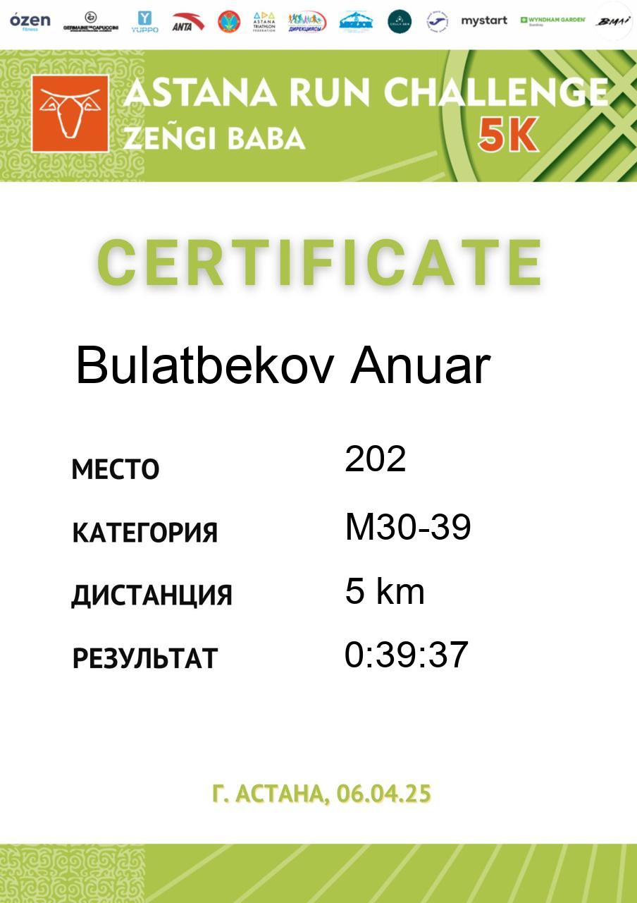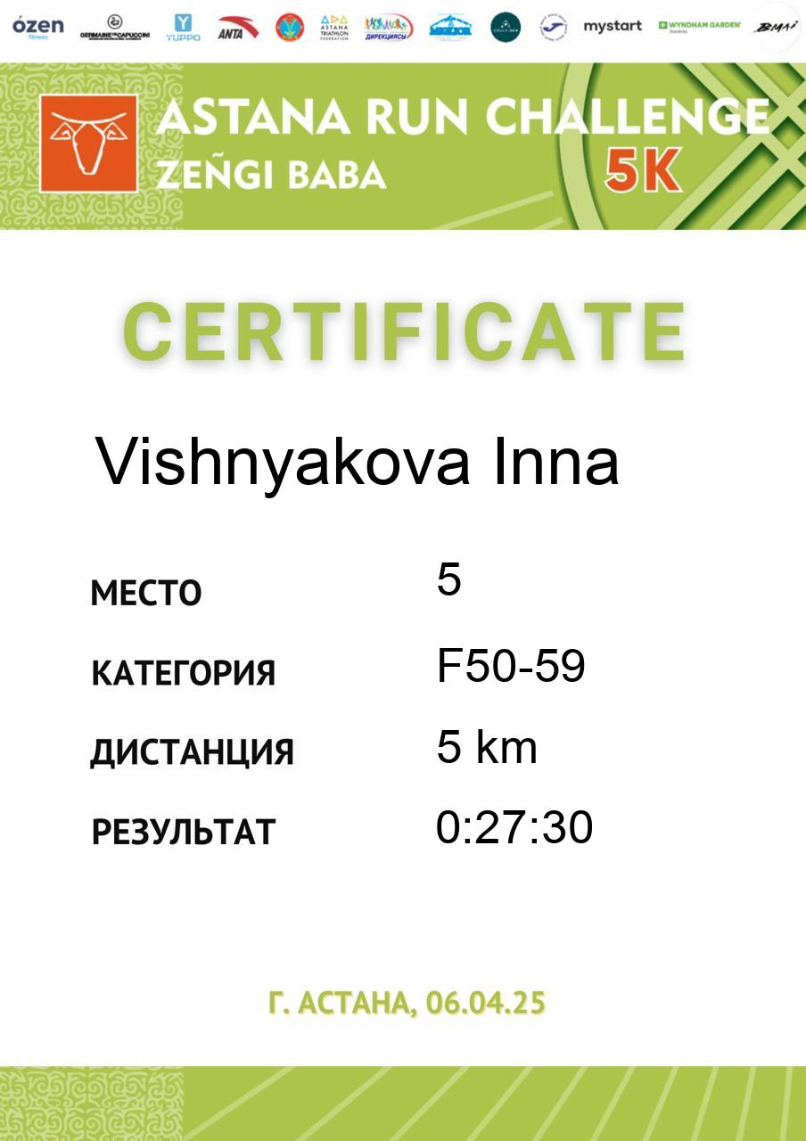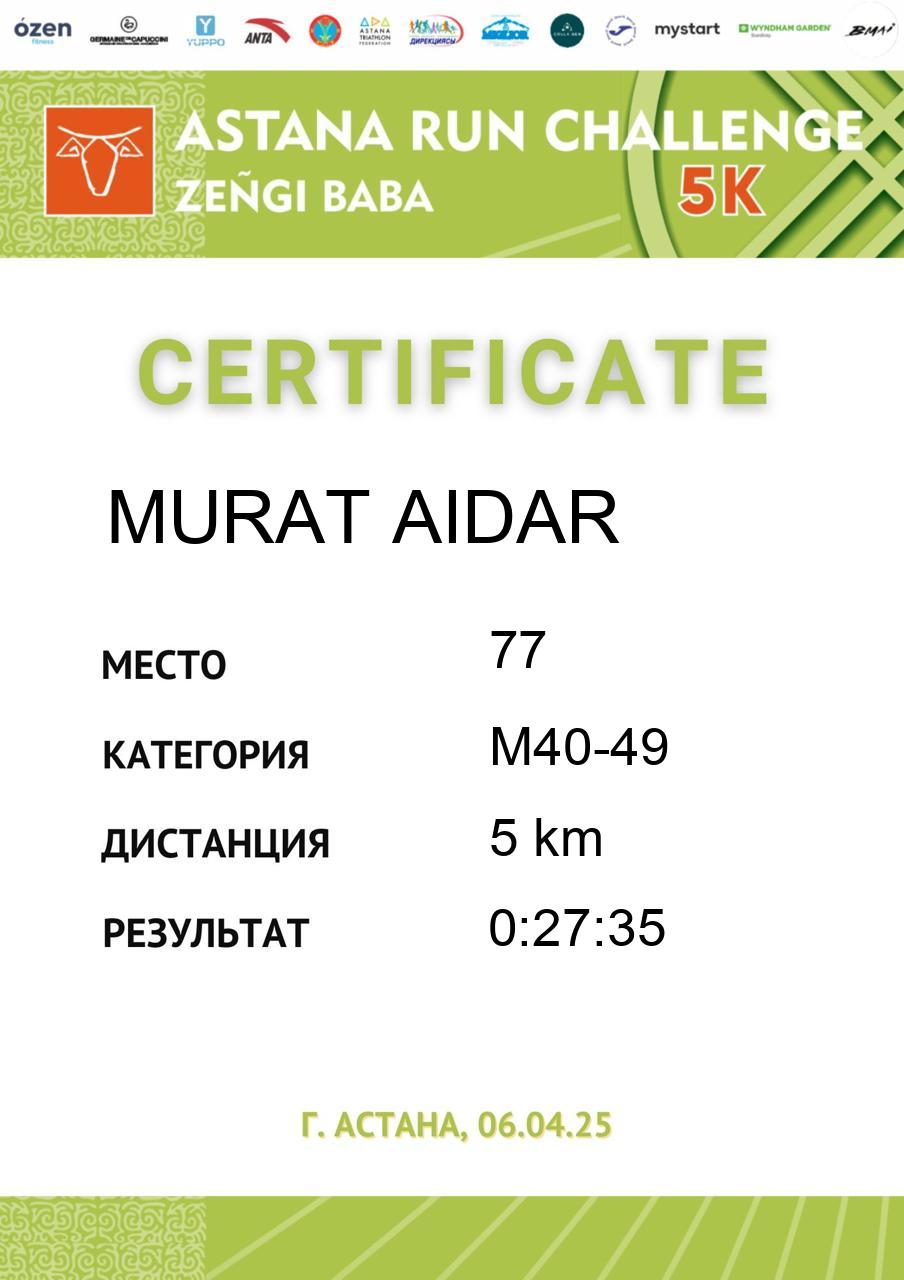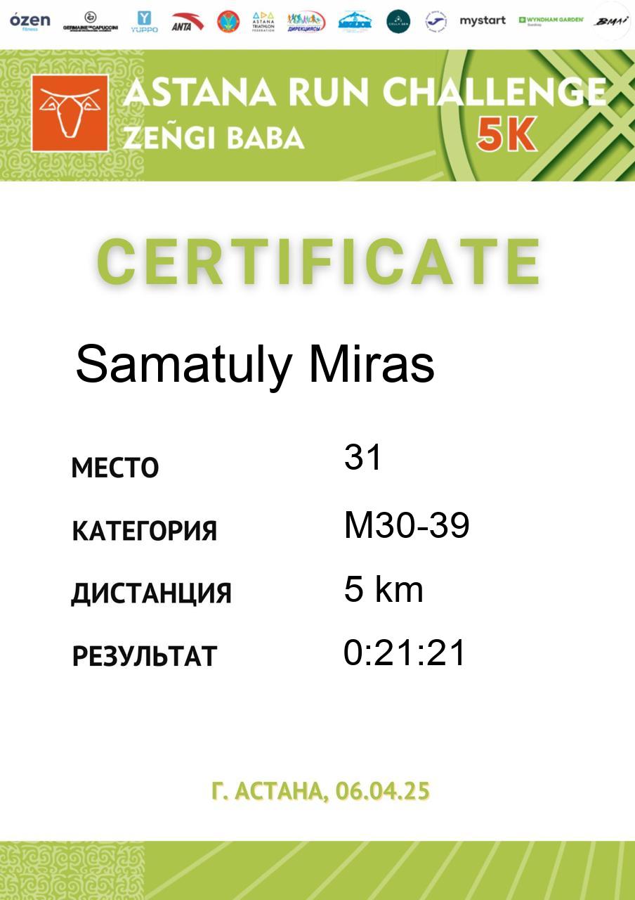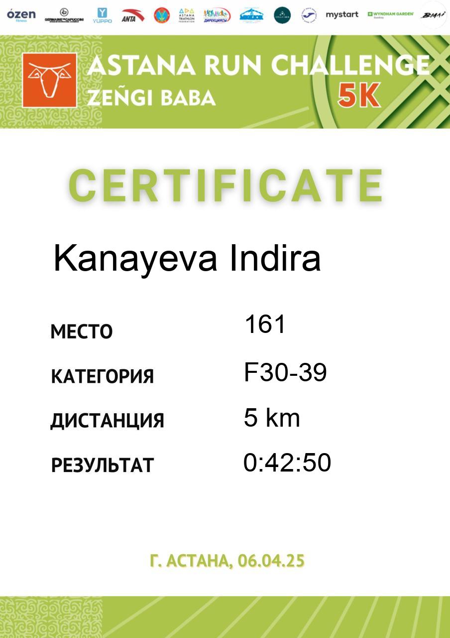 | 5 | Gali Dinmukhammed | 255 | M50-59 | 5 km | 0:21:37 | 91 | Жүктеу |