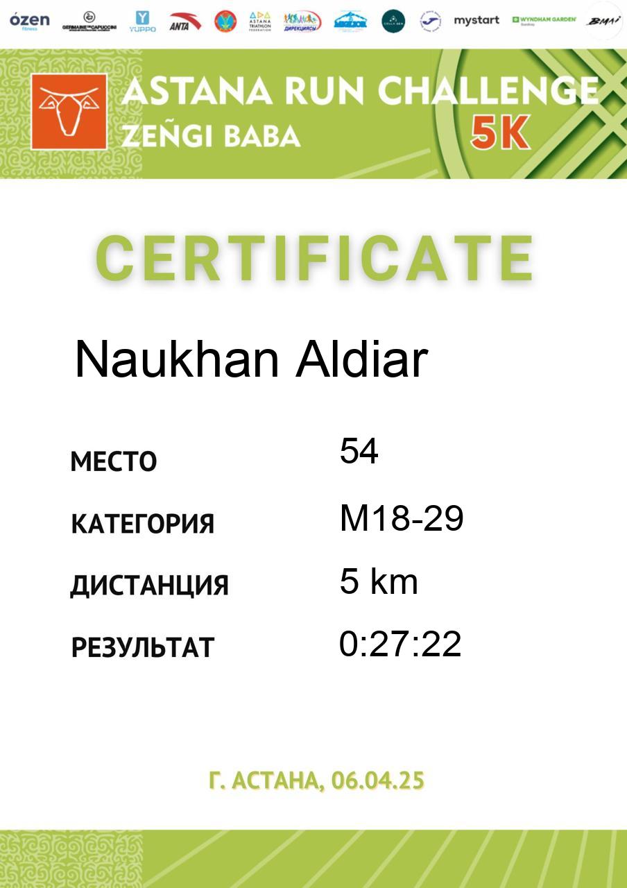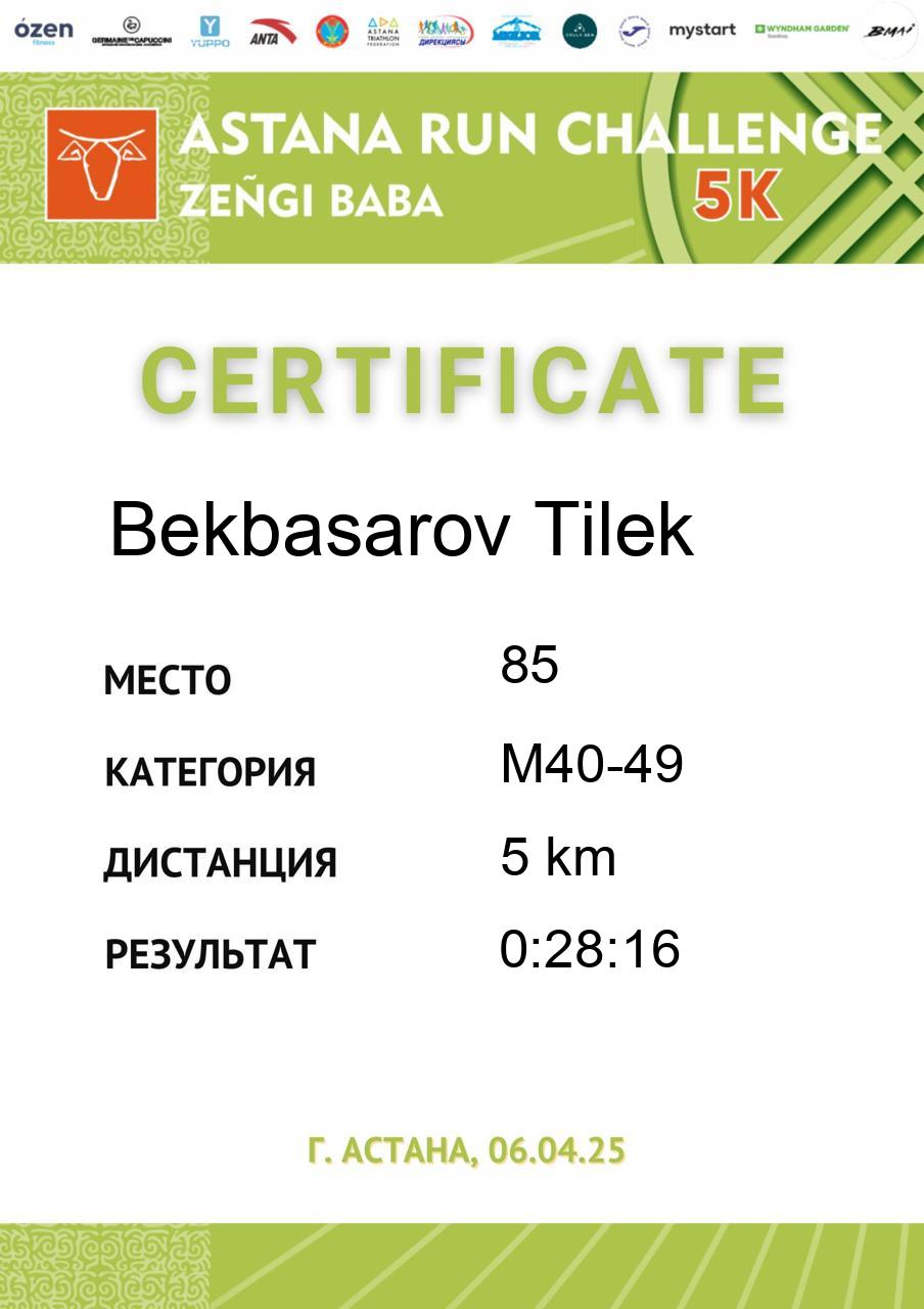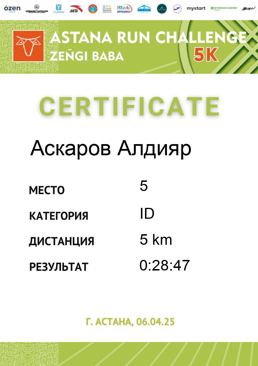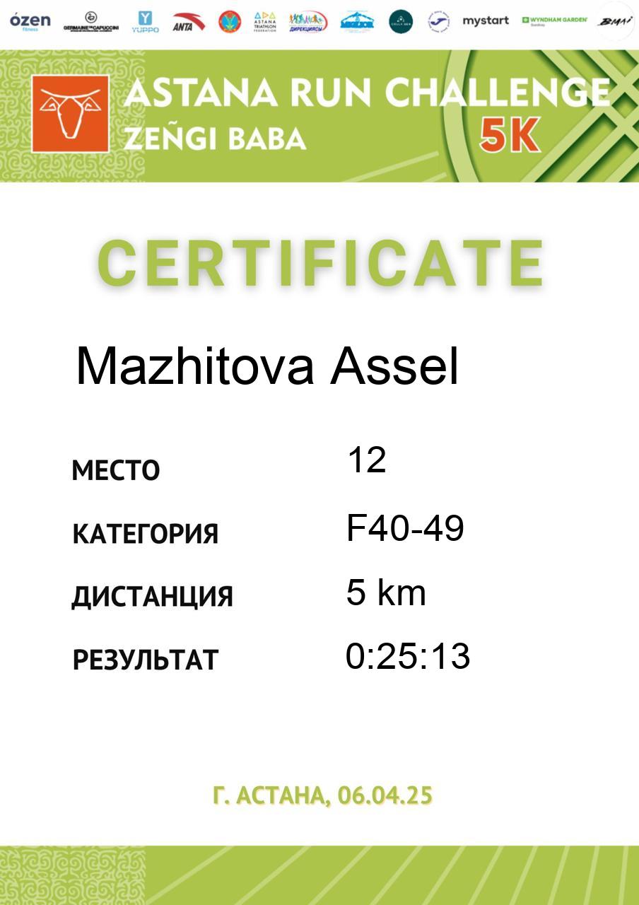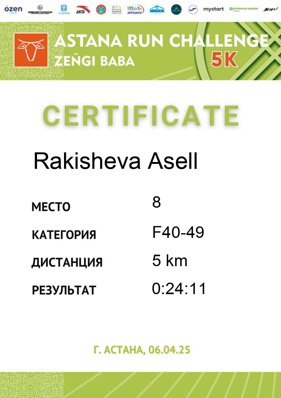 | 5 | Gali Dinmukhammed | 255 | M50-59 | 5 km | 0:21:37 | 91 | Жүктеу |