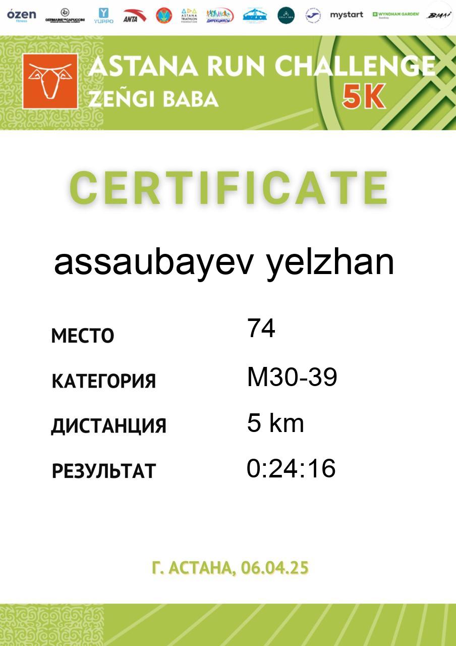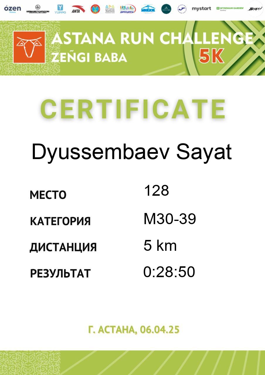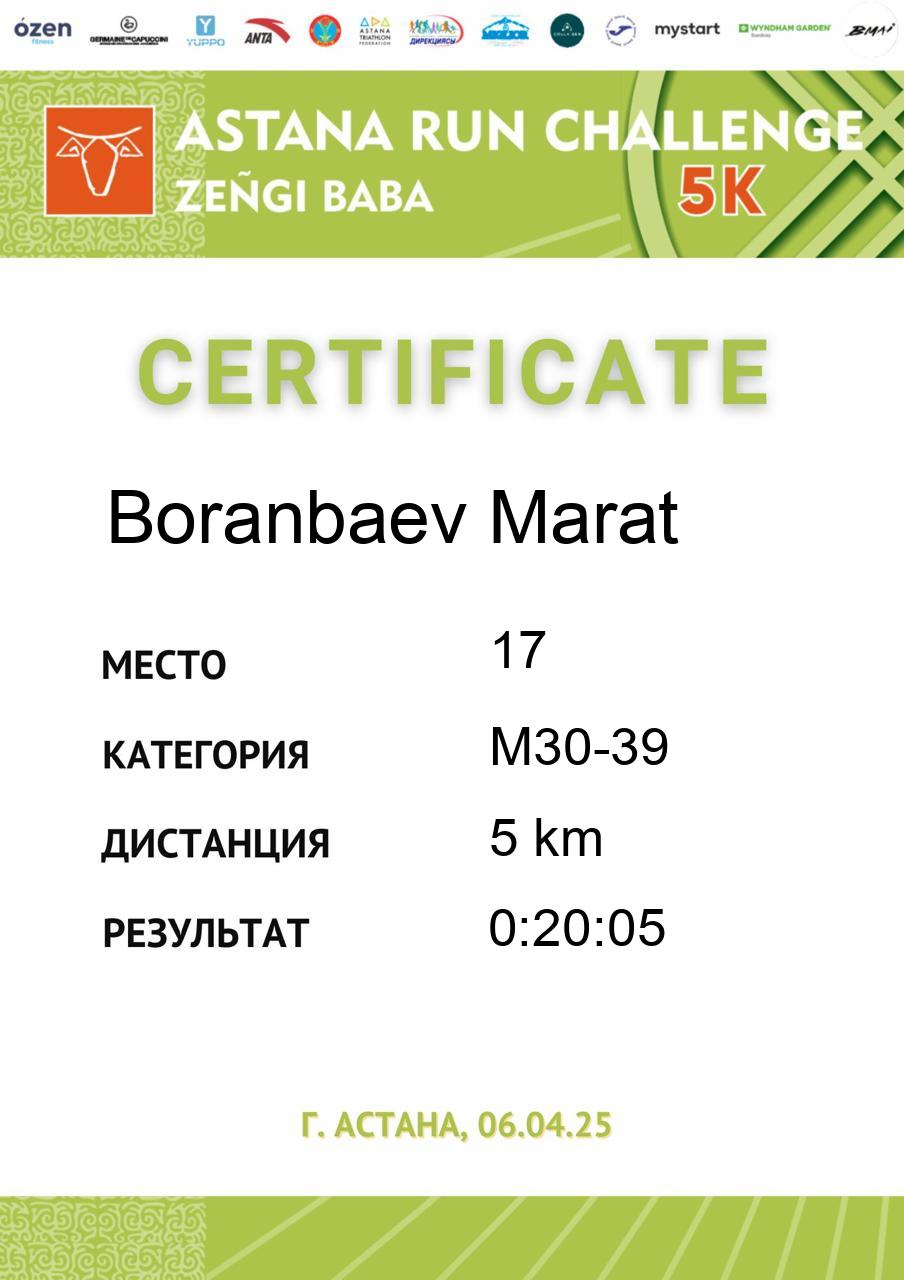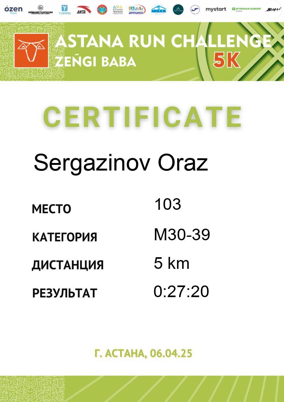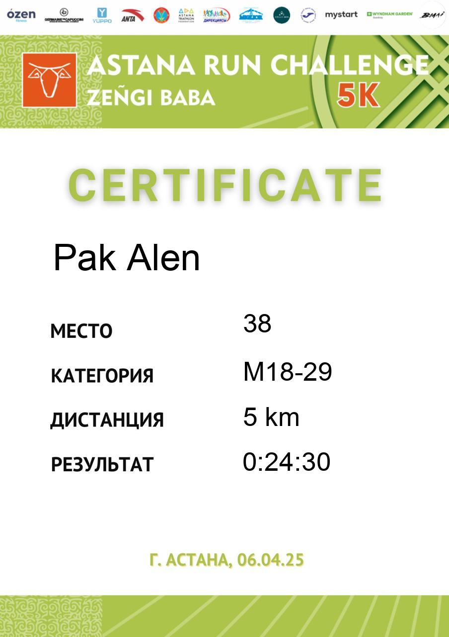 | 5 | Gali Dinmukhammed | 255 | M50-59 | 5 km | 0:21:37 | 91 | Жүктеу |