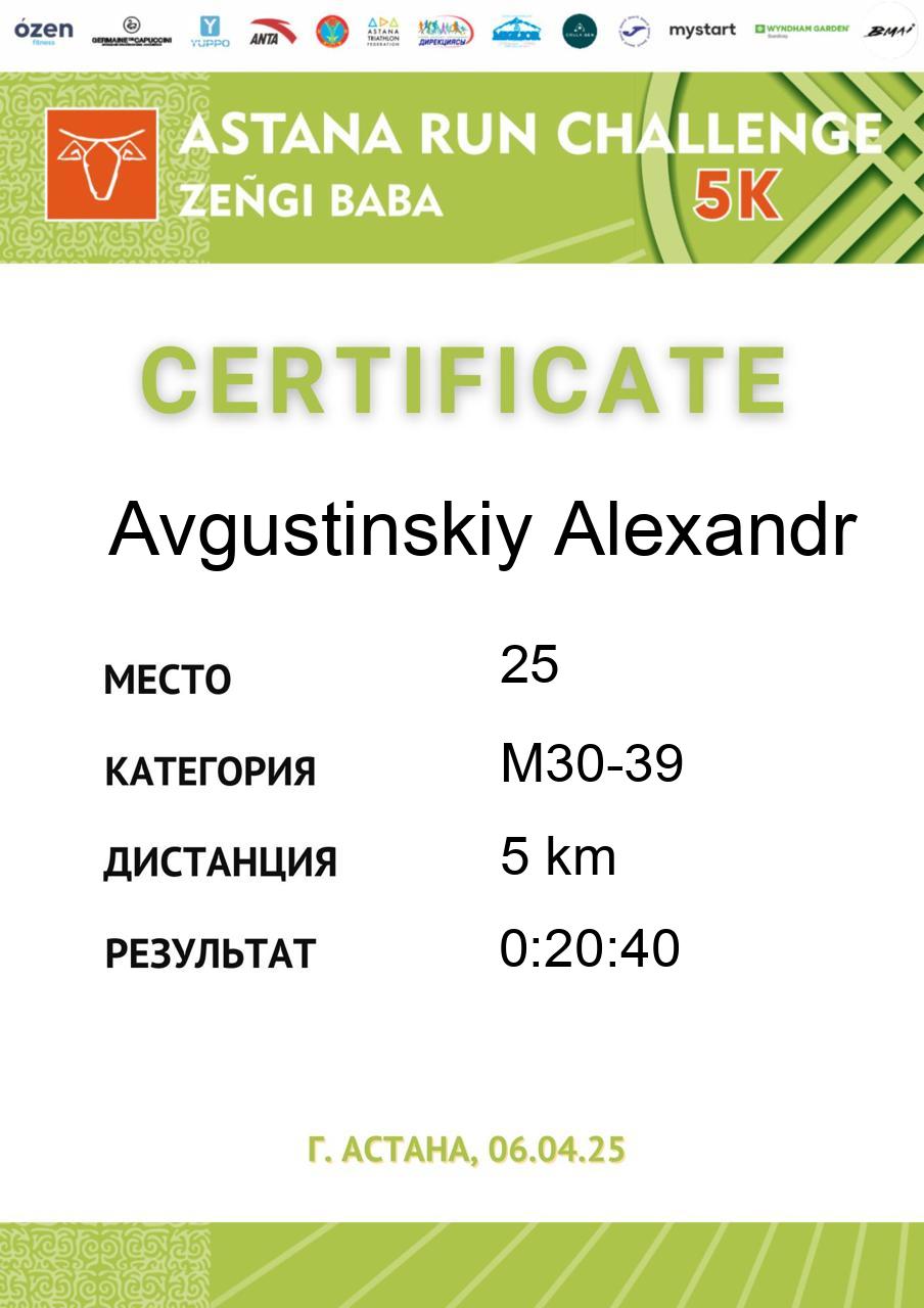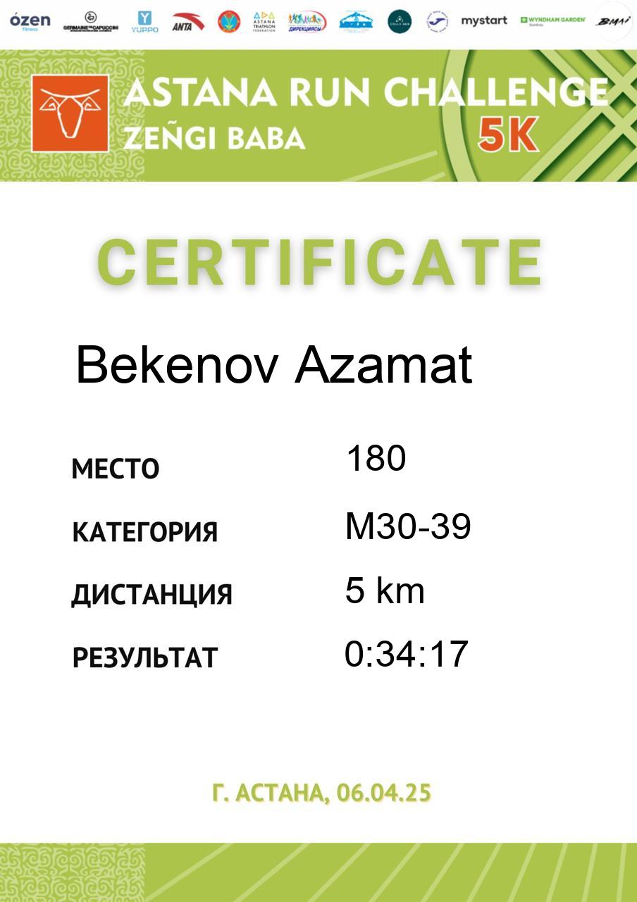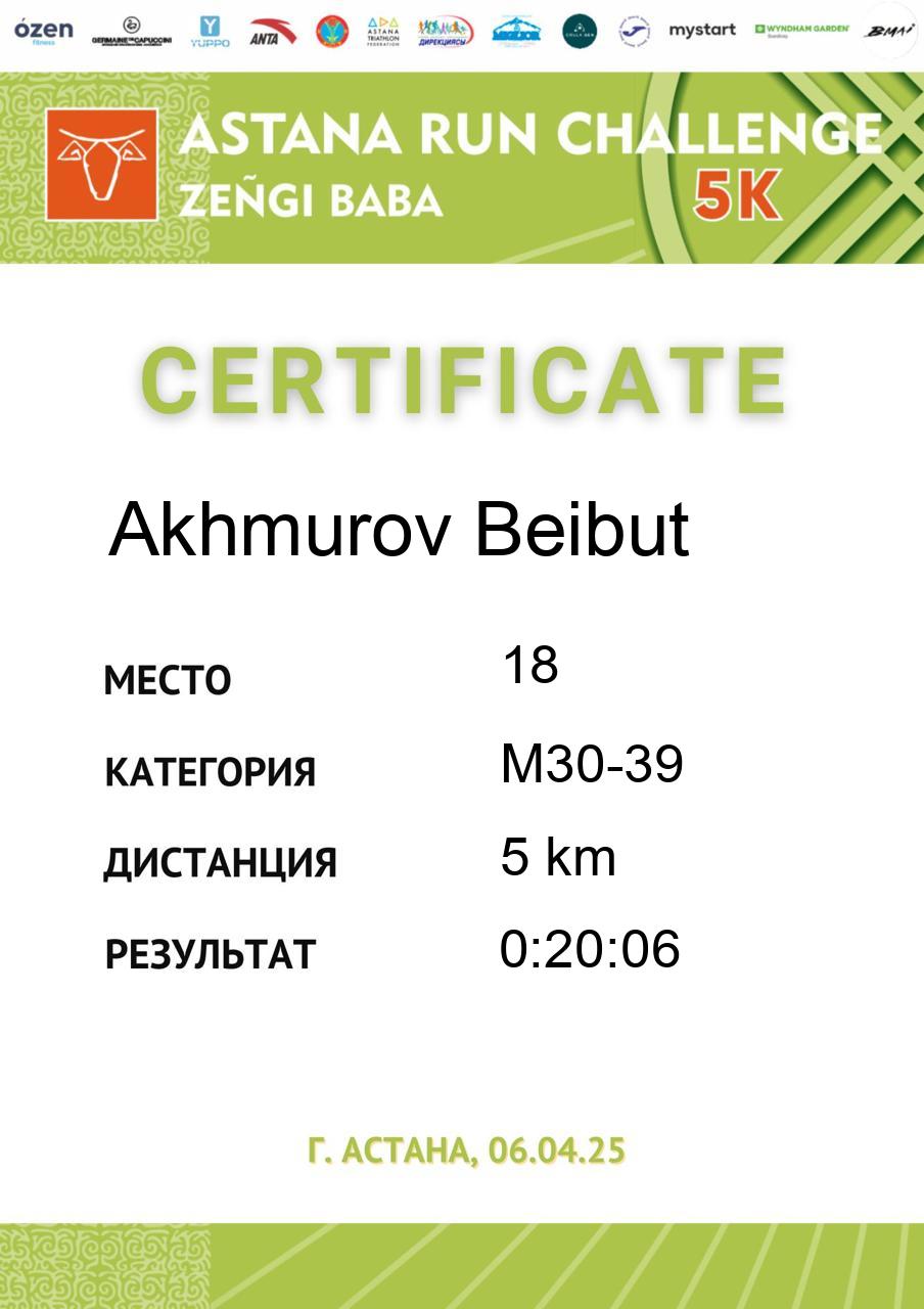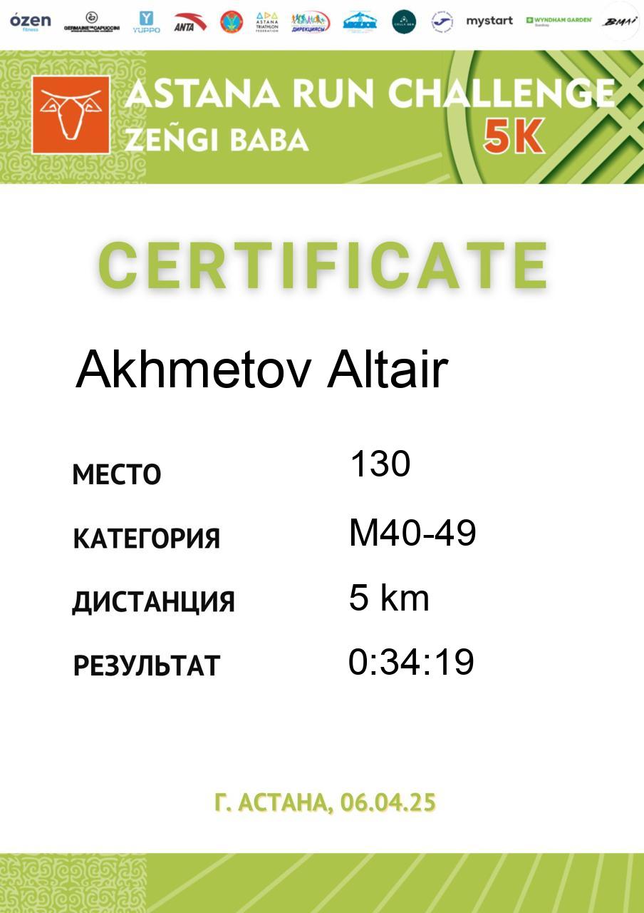 | 130 | Akhmetov Altair | 856 | M40-49 | 5 km | 0:34:19 | 648 | Жүктеу |