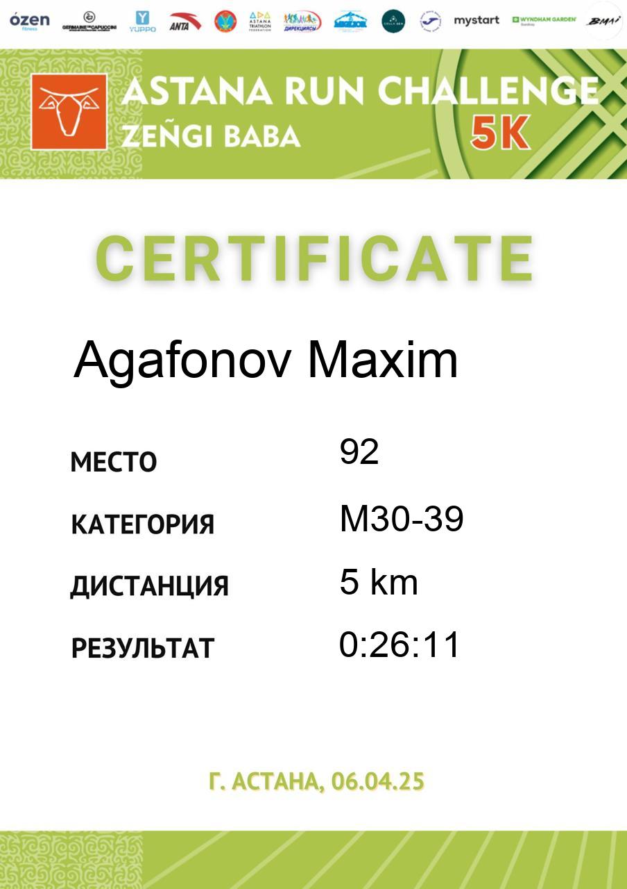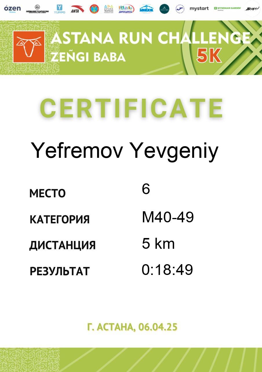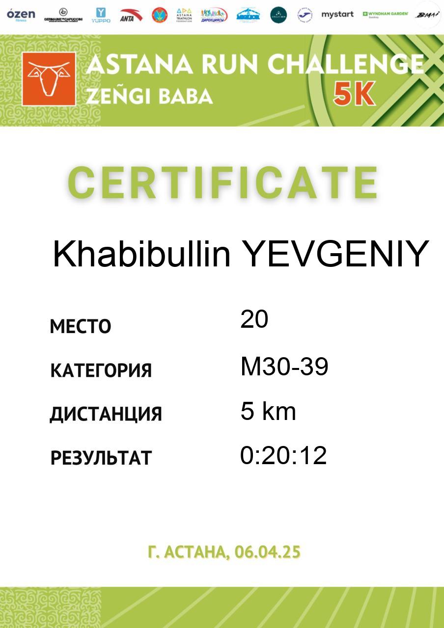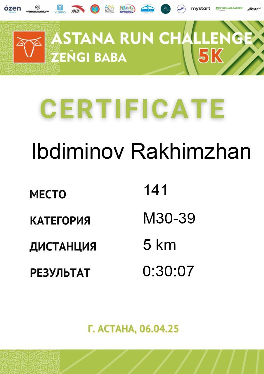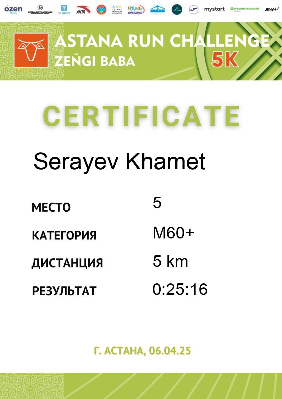 | 5 | Serayev Khamet | 619 | M60+ | 5 km | 0:25:16 | 251 | Жүктеу |