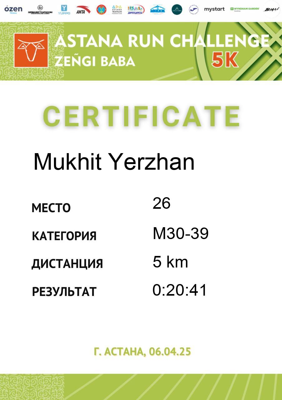 | 5 | Bakhytzhankyzy Madina | 126 | ВК | 5 km | 0:41:39 | 797 | Жүктеу |
