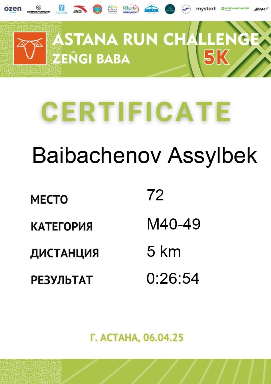 | 123 | Baimukhametov Asset | 120 | M40-49 | 5 km | 0:32:37 | 573 | Жүктеу |