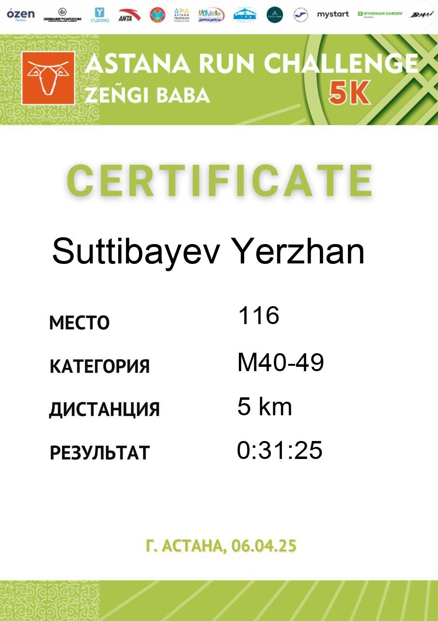 | 116 | Suttibayev Yerzhan | 675 | M40-49 | 5 km | 0:31:25 | 519 | Жүктеу |