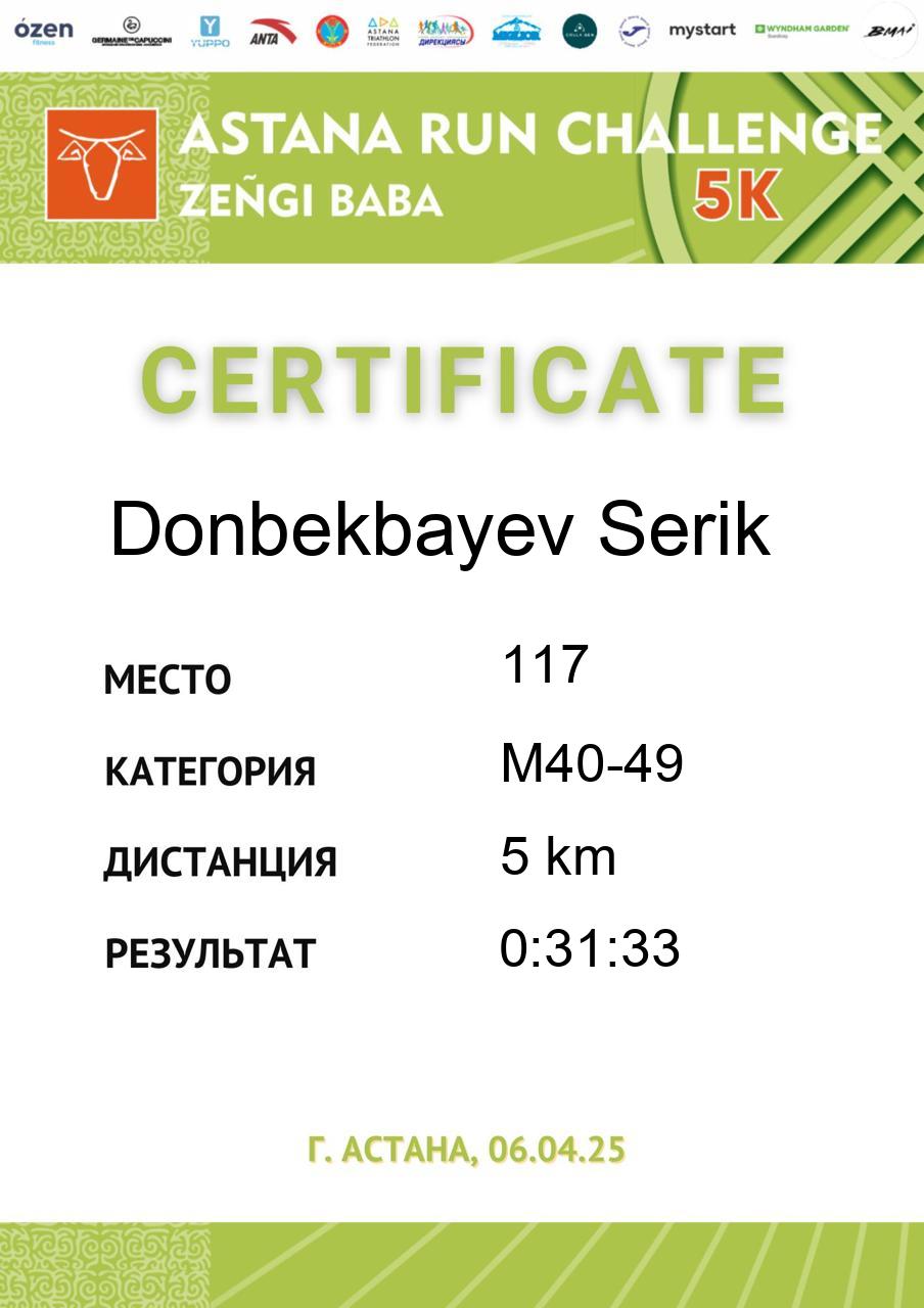 | 117 | Donbekbayev Serik | 227 | M40-49 | 5 km | 0:31:33 | 526 | Жүктеу |