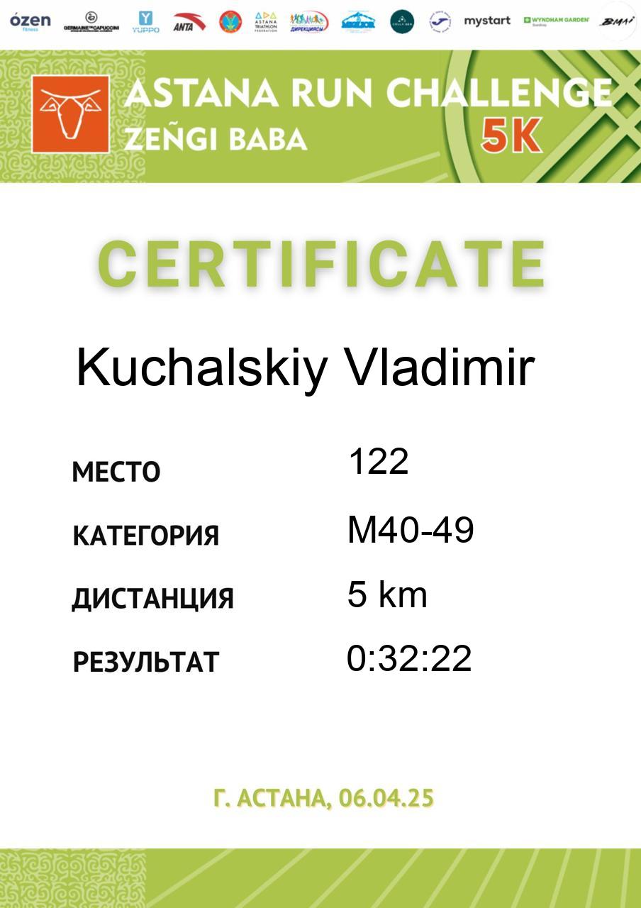 | 122 | Kuchalskiy Vladimir | 412 | M40-49 | 5 km | 0:32:22 | 564 | Жүктеу |