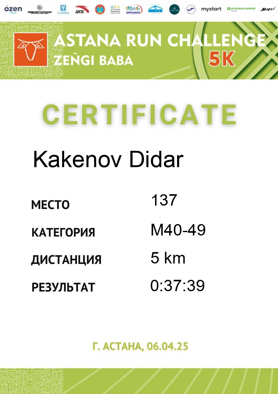 | 137 | Kakenov Didar | 319 | M40-49 | 5 km | 0:37:39 | 733 | Жүктеу |
