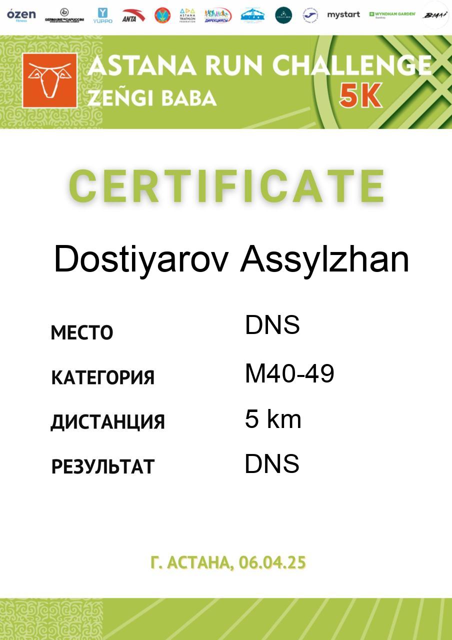 | DNS | Dostiyarov Assylzhan | 872 | M40-49 | 5 km | DNS | DNS | Жүктеу |