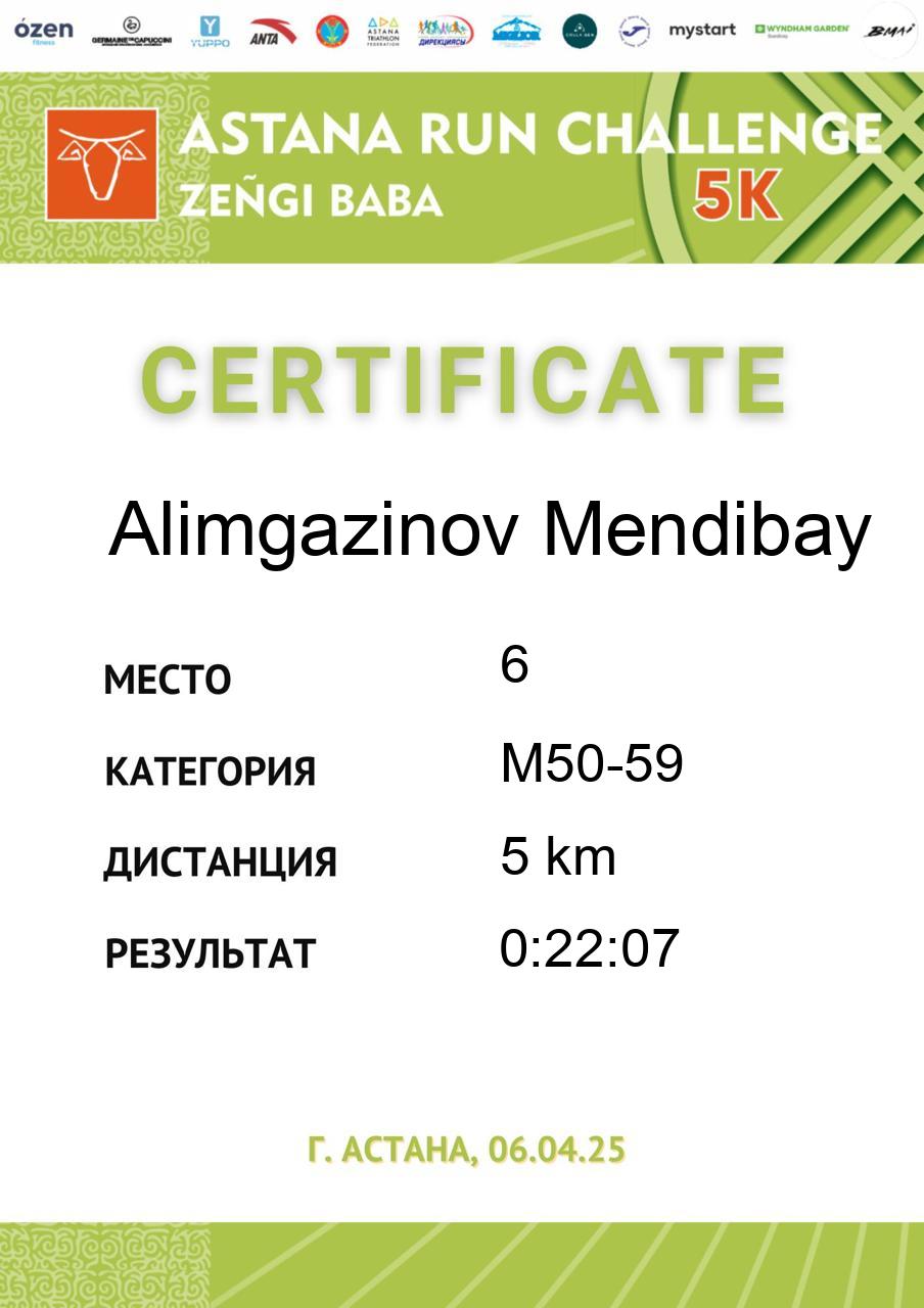 | 6 | Alimgazinov Mendibay | 878 | M50-59 | 5 km | 0:22:07 | 108 | Жүктеу |