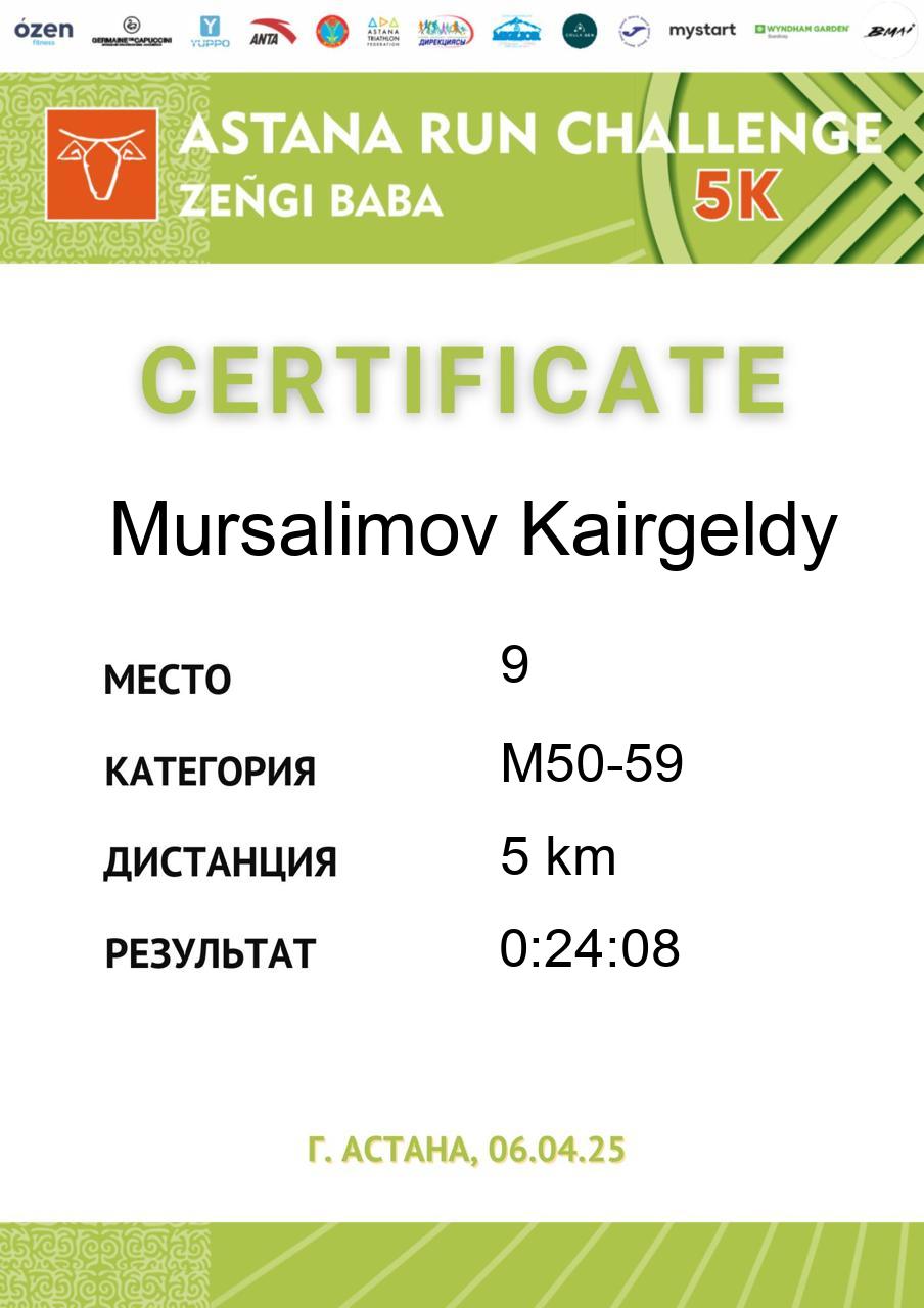 | 9 | Mursalimov Kairgeldy | 505 | M50-59 | 5 km | 0:24:08 | 201 | Жүктеу |