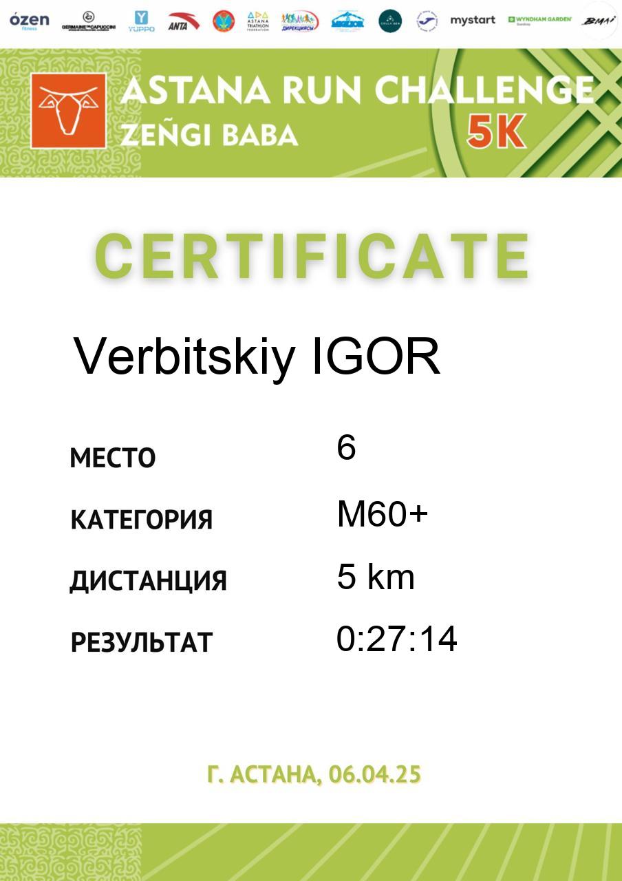 | 6 | Verbitskiy IGOR | 741 | M60+ | 5 km | 0:27:14 | 312 | Жүктеу |