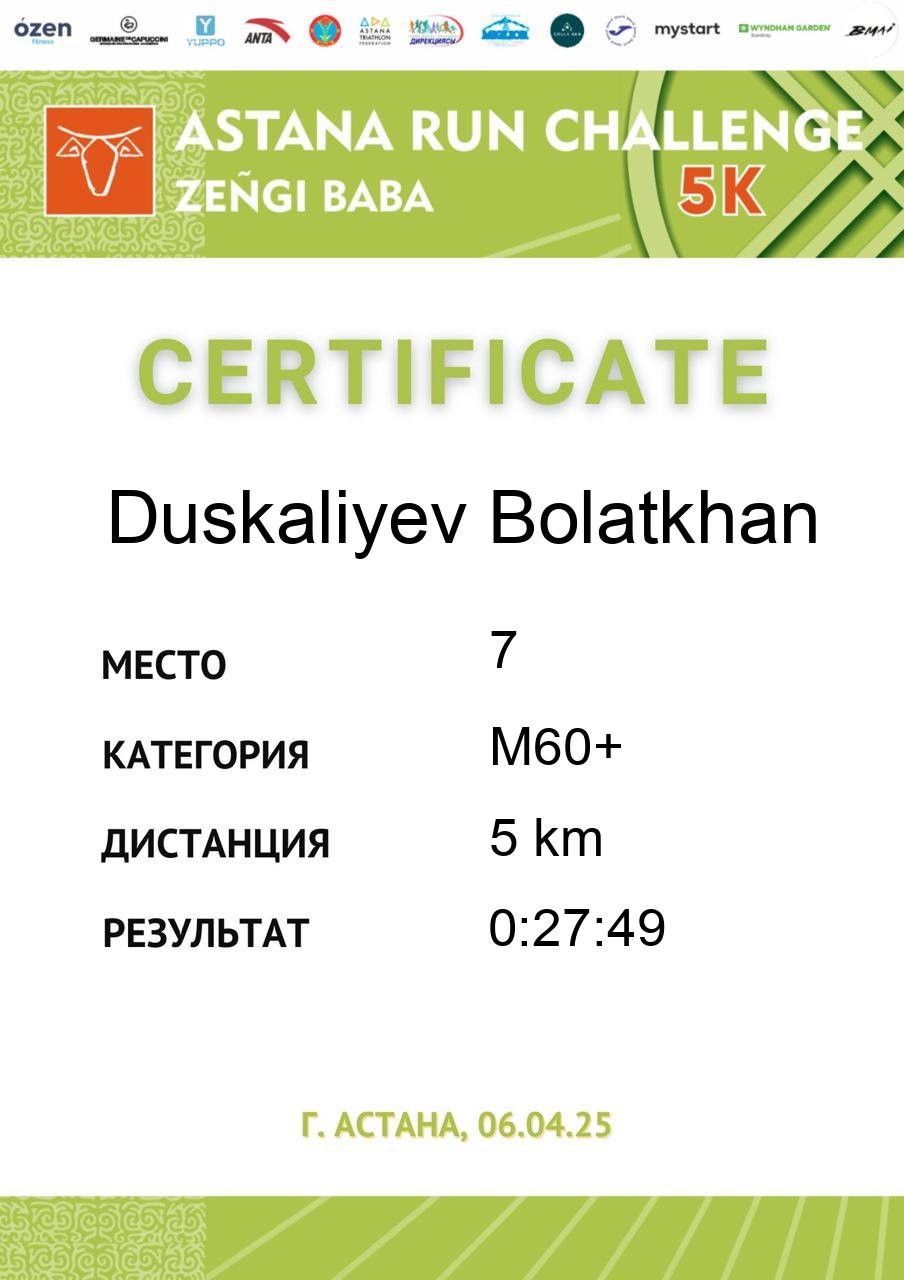 | 7 | Duskaliyev Bolatkhan | 233 | M60+ | 5 km | 0:27:49 | 352 | Жүктеу |