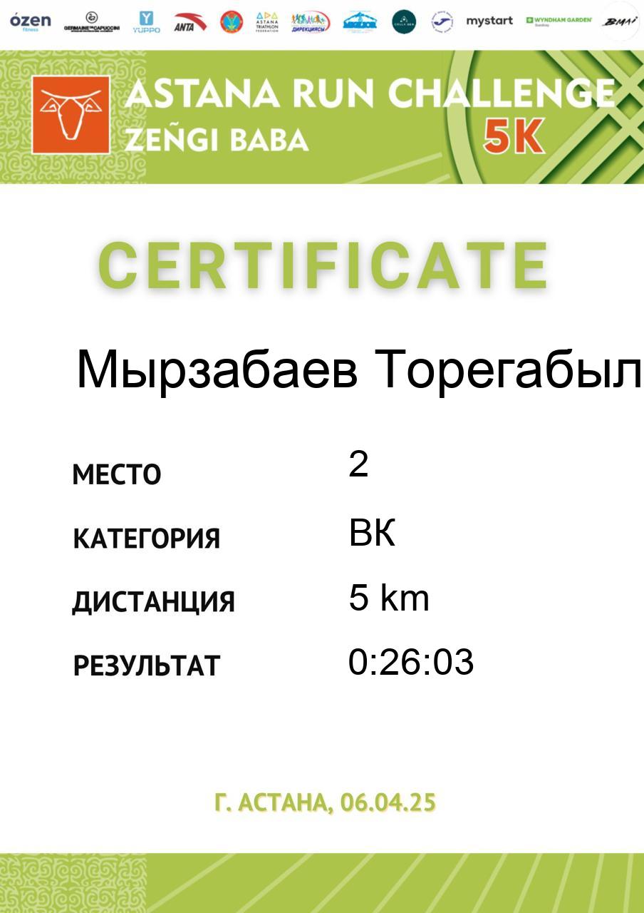 | 2 | Мырзабаев Торегабыл | 6 | ВК | 5 km | 0:26:03 | 270 | Жүктеу |