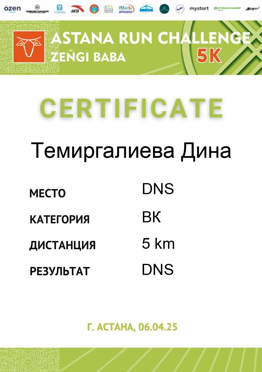 | DNS | Темиргалиева Дина | 854 | ВК | 5 km | DNS | DNS | Жүктеу |