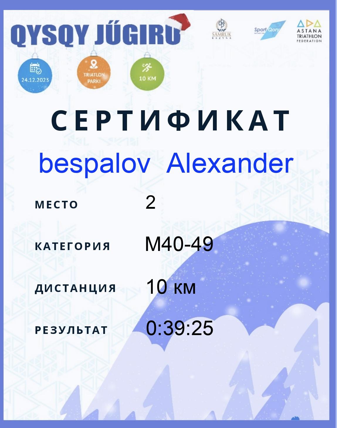 | 2 | bespalov Alexander | 51 | M40-49 | 10 км | 0:39:25 | Жүктеу |