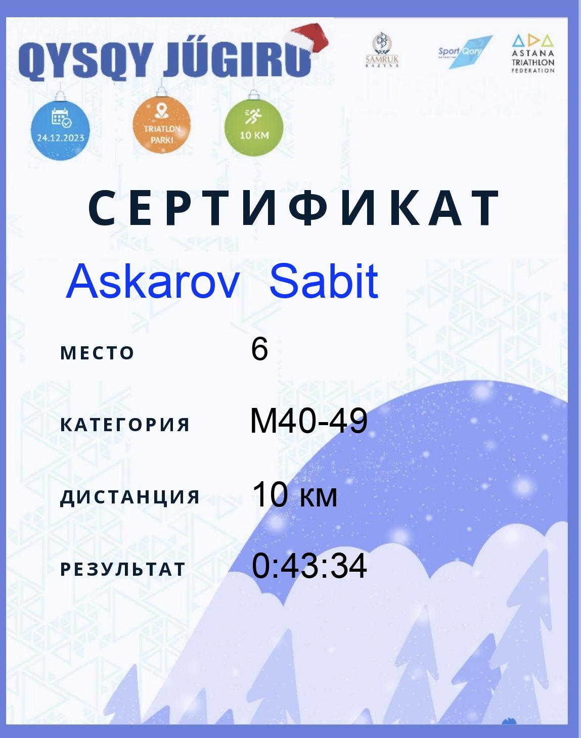 | 6 | Askarov Sabit | 26 | M40-49 | 10 км | 0:43:34 | Жүктеу |