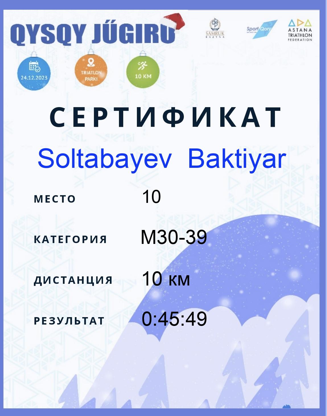 | 10 | Soltabayev Baktiyar | 224 | M30-39 | 10 км | 0:45:49 | Жүктеу |