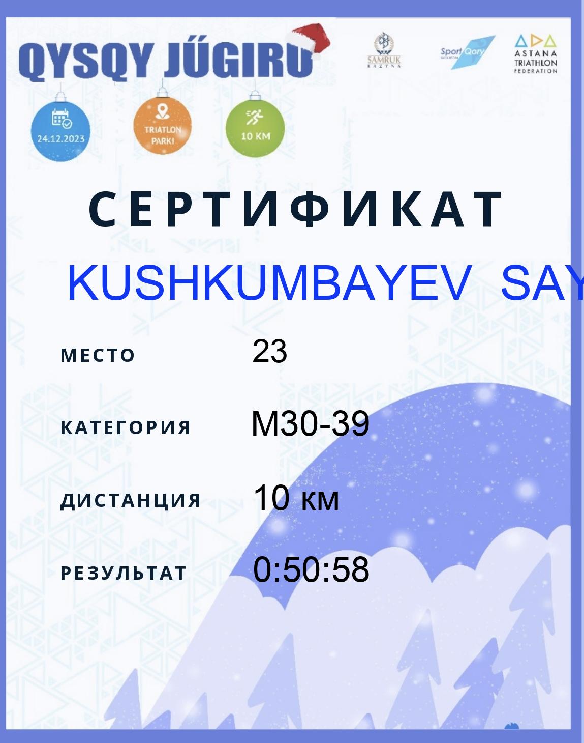 | 23 | KUSHKUMBAYEV SAYAT | 132 | M30-39 | 10 км | 0:50:58 | Жүктеу |