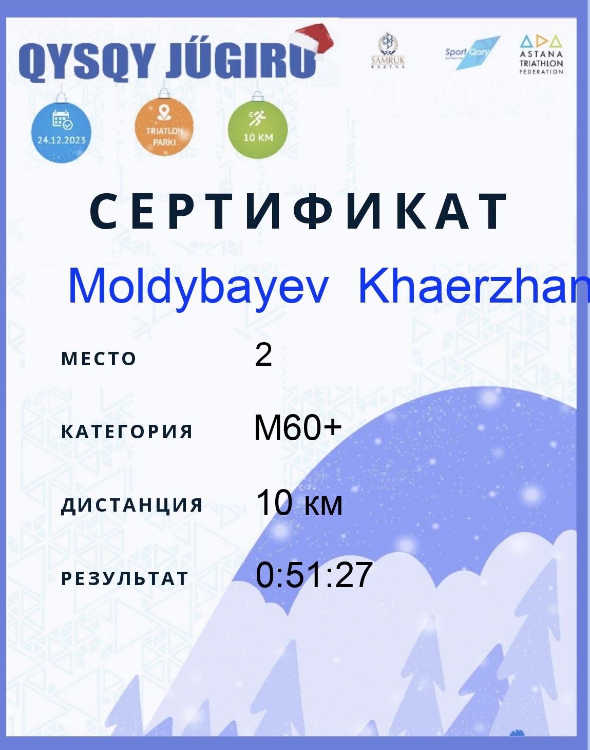 | 2 | Moldybayev Khaerzhan | 156 | M60+ | 10 км | 0:51:27 | Жүктеу |