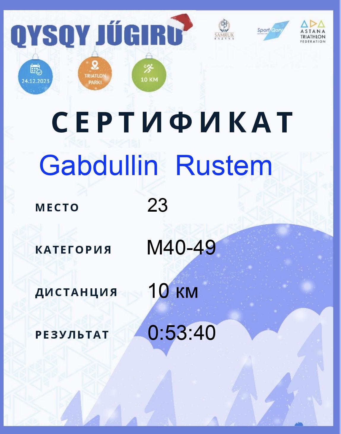 | 23 | Gabdullin Rustem | 83 | M40-49 | 10 км | 0:53:40 | Жүктеу |
