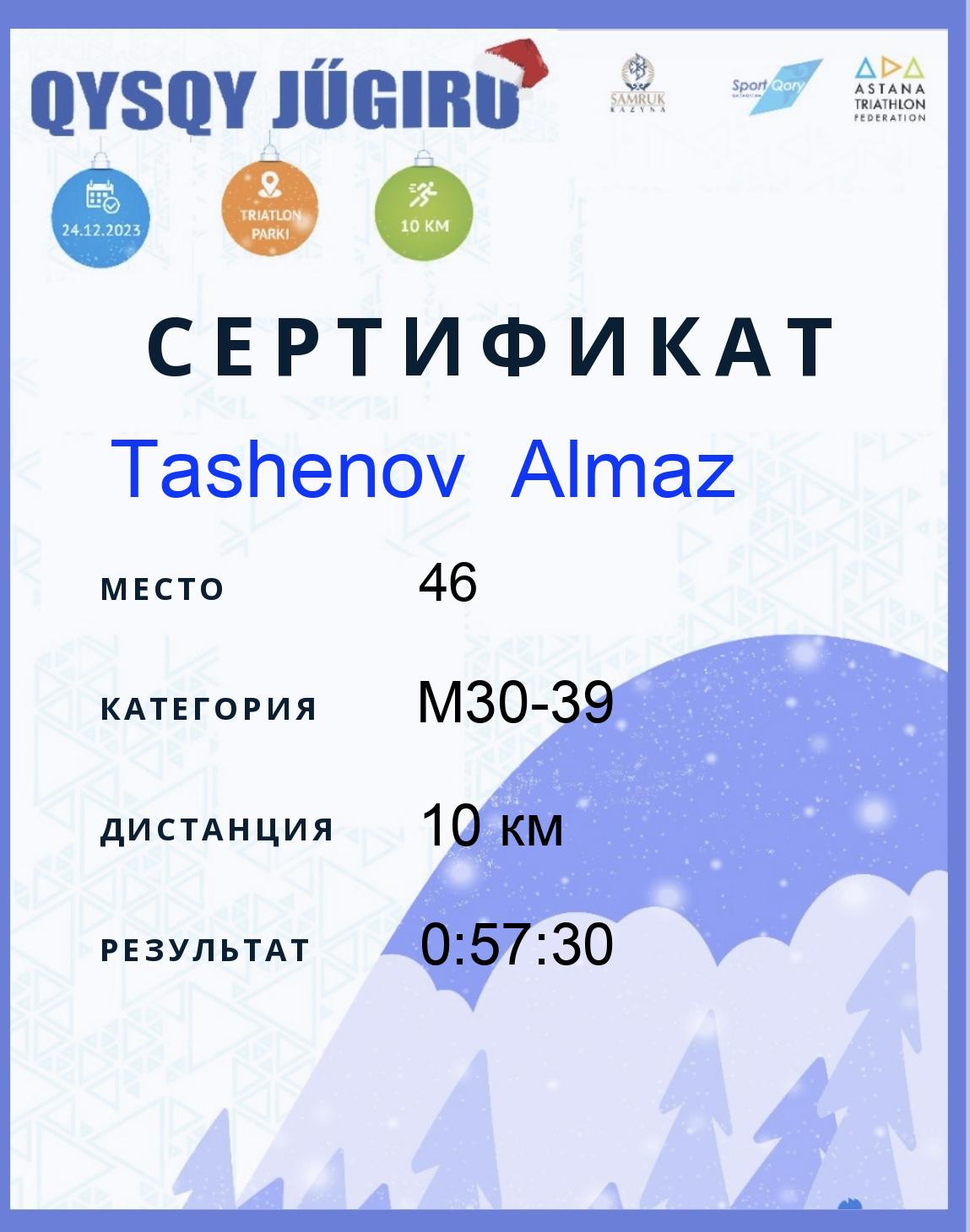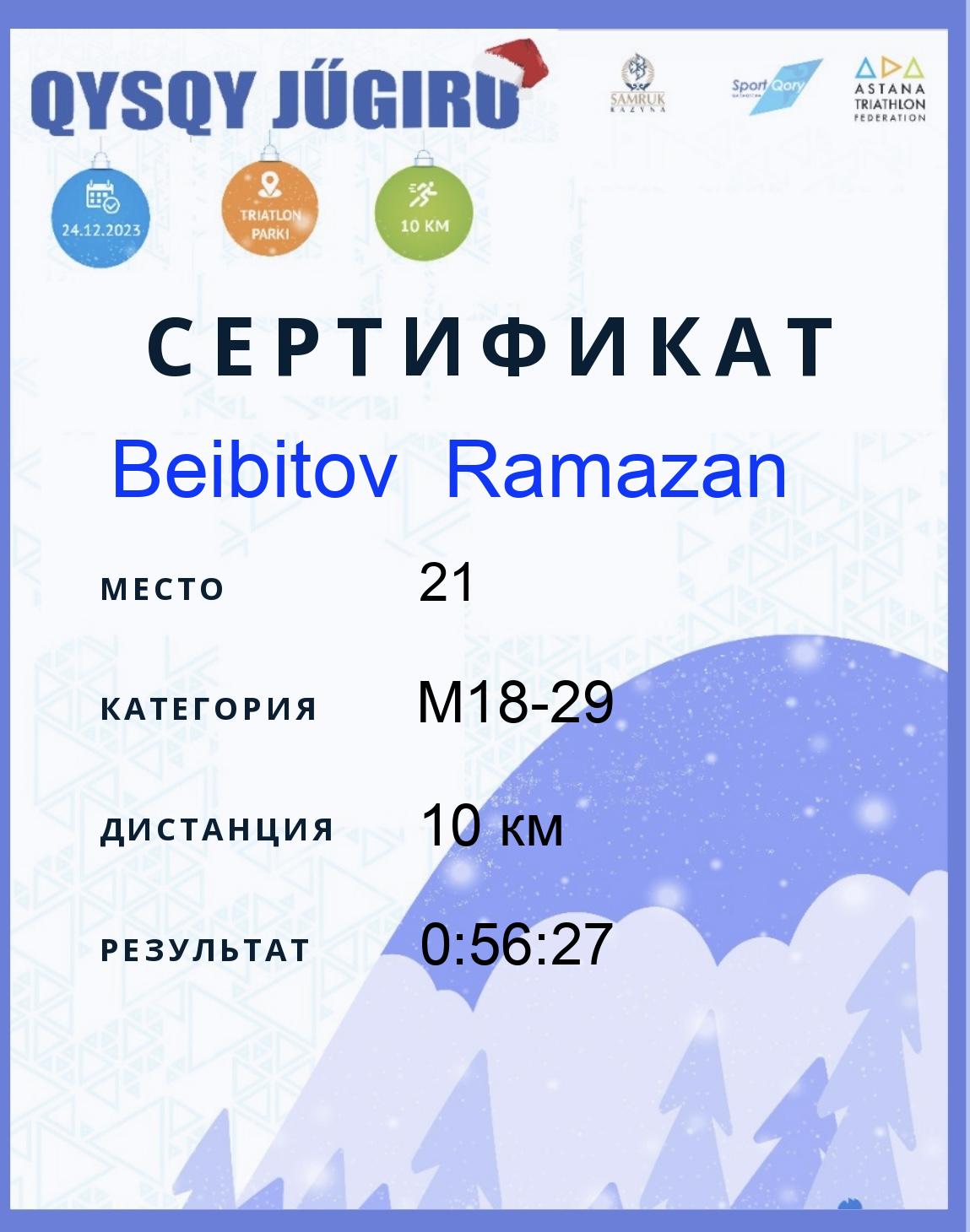 | 76 | Ablezov Mars | 6 | M30-39 | 10 км | 1:06:25 | Жүктеу |