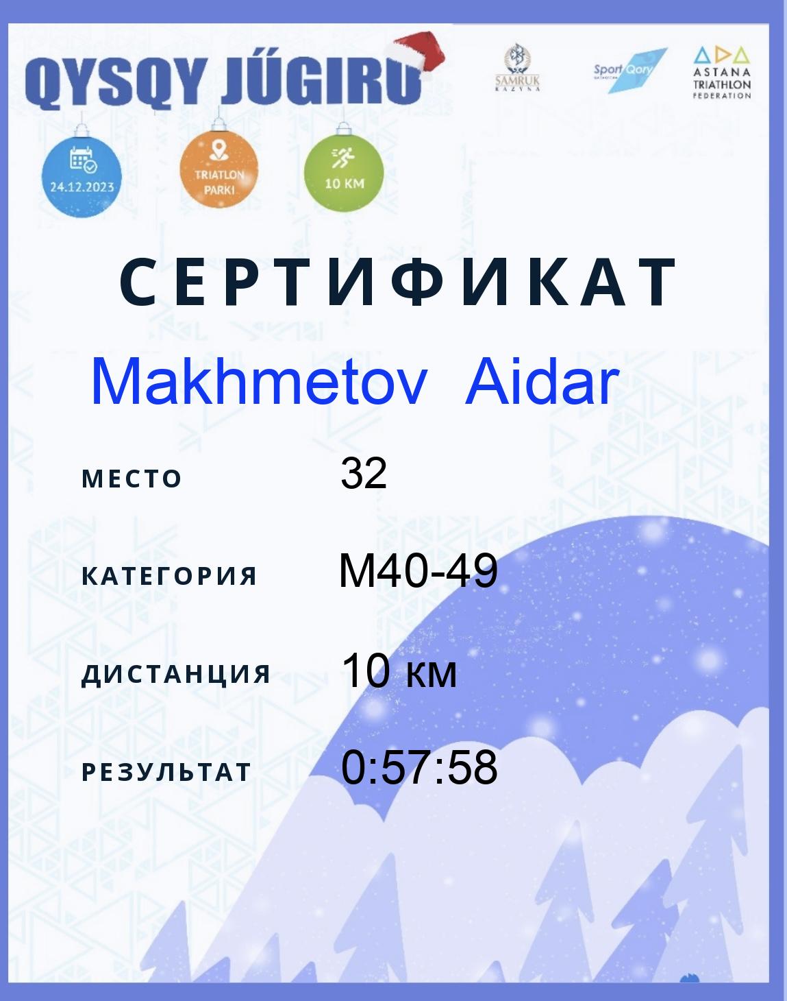| 13 | Makhambetov Eldos | 147 | M40-49 | 10 км | 0:47:56 | Жүктеу |