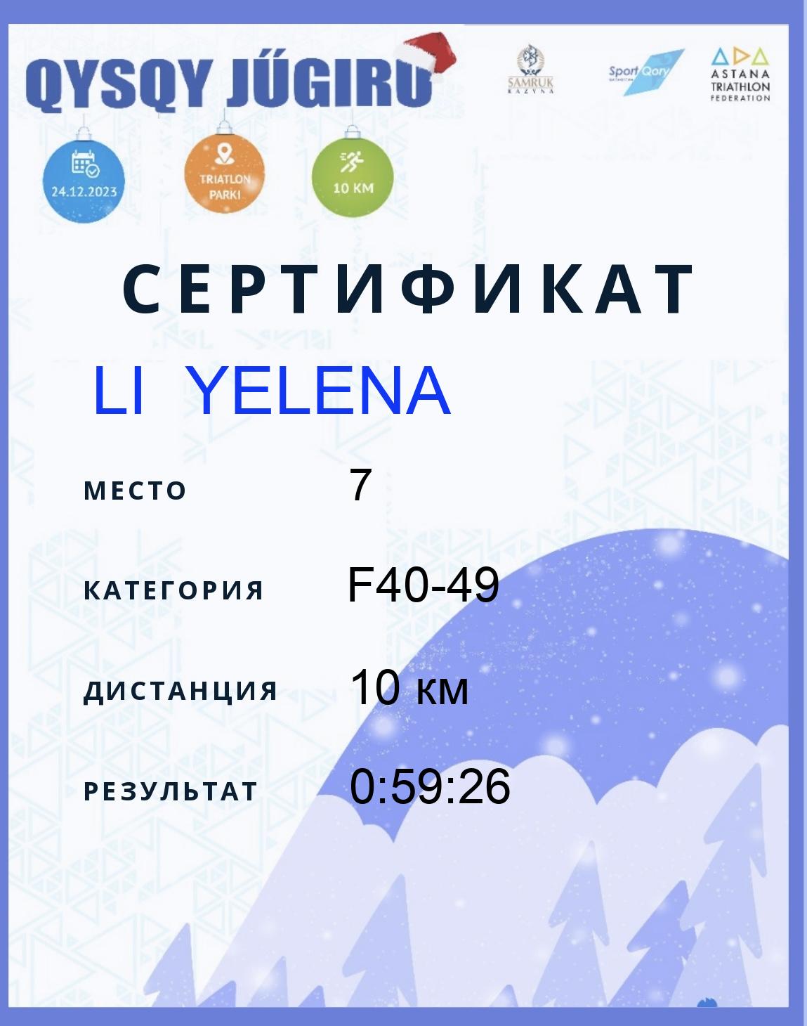 | 1 | Yelisseyeva Anastassiya | 255 | F40-49 | 10 км | 0:46:56 | Жүктеу |