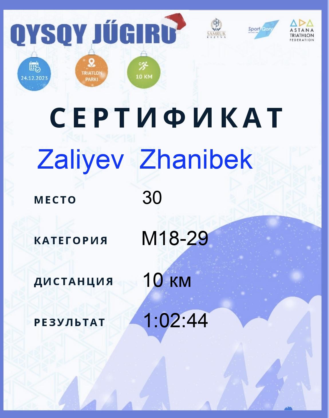 | 1 | Zhanmurzin Daniyar | 275 | M18-29 | 10 км | 0:42:39 | Жүктеу |