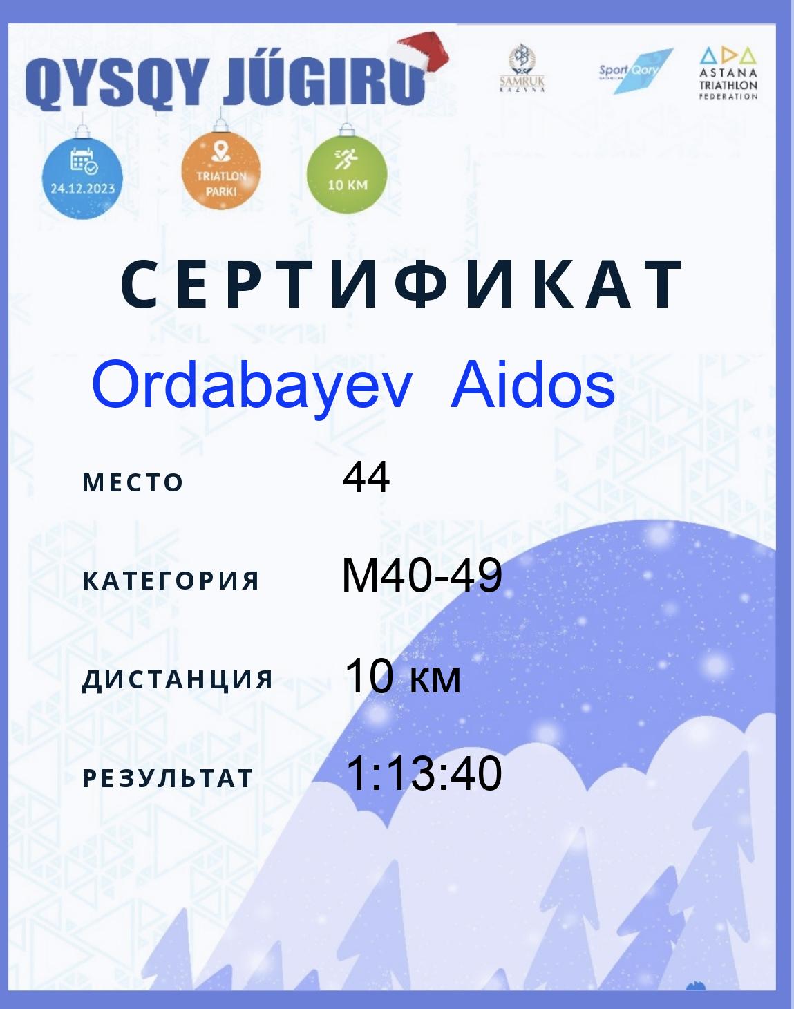 | 44 | Ordabayev Aidos | 182 | M40-49 | 10 км | 1:13:40 | Жүктеу |