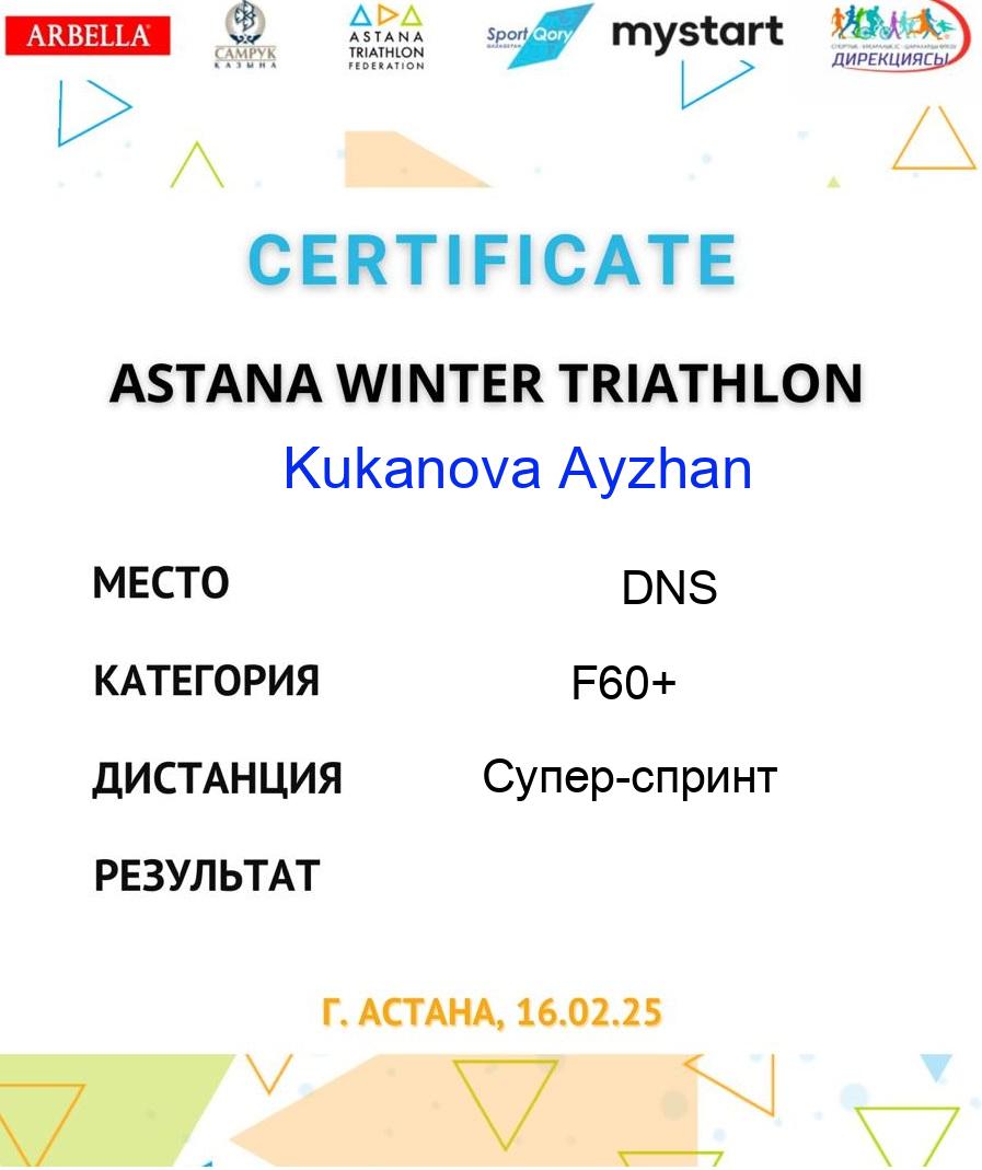 | DNS | Kukanova Ayzhan | 146 | F60+ | Супер-спринт | DNS | Скачать | ||||||