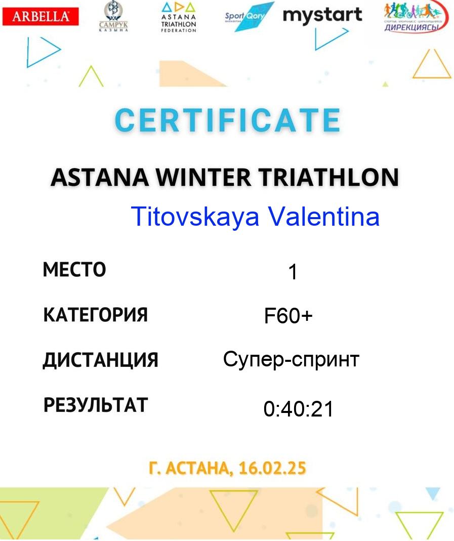 | 2 | Talap Ulpan | 215 | F40-49 | Супер-спринт | 52 | 0:13:42 | 0:01:05 | 0:11:00 | 0:02:17 | 0:14:35 | 0:42:37 | Скачать |
