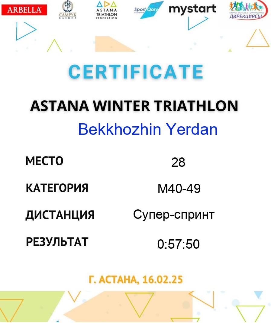| 28 | Bekkhozhin Yerdan | 126 | M40-49 | Супер-спринт | 75 | 0:14:20 | 0:01:30 | 0:09:46 | 0:02:35 | 0:29:41 | 0:57:50 | Скачать |