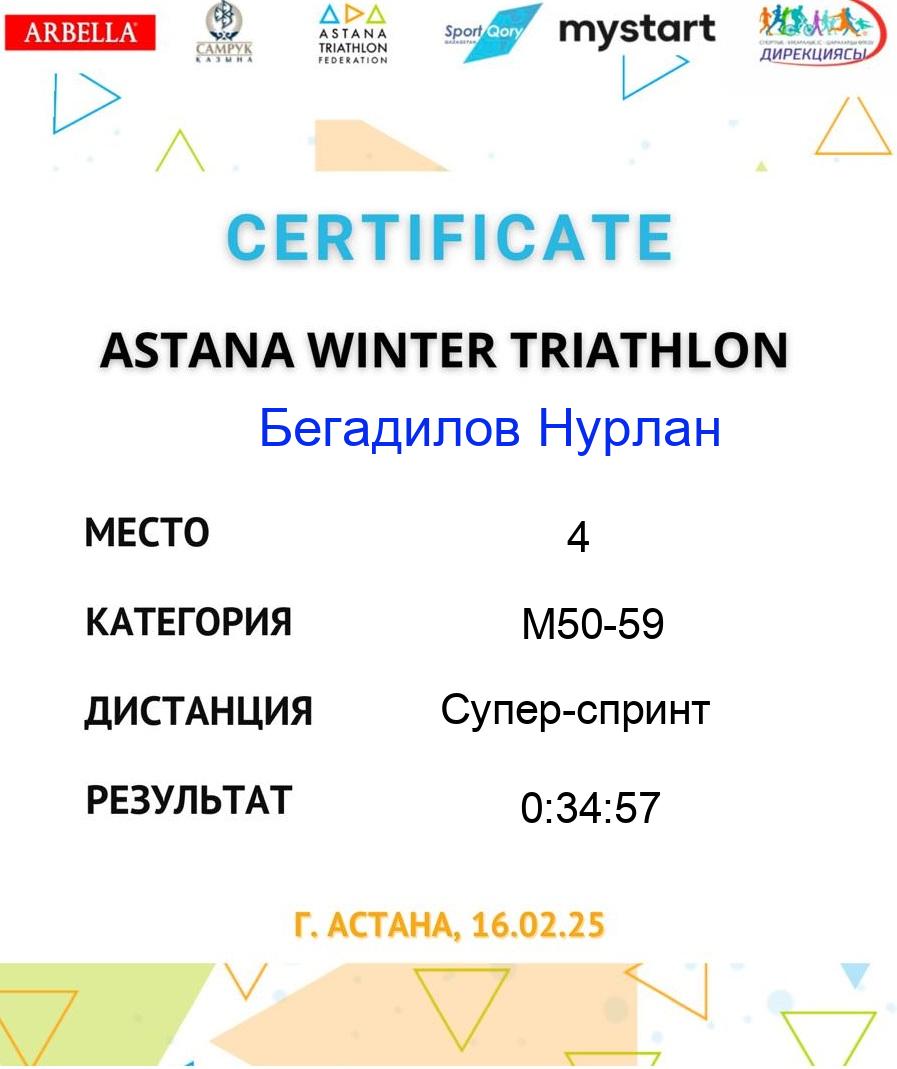 | 4 | Бегадилов Нурлан | 210 | M50-59 | Супер-спринт | 26 | 0:10:13 | 0:01:00 | 0:07:54 | 0:01:40 | 0:14:12 | 0:34:57 | Скачать |