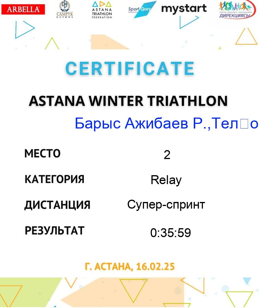 | 2 | Барыс Ажибаев Р.,Телқозы Ә.,Қайролла Т. | 220 | Relay | Супер-спринт | 30 | 0:09:39 | 0:01:07 | 0:10:07 | 0:01:14 | 0:13:53 | 0:35:59 | Скачать |