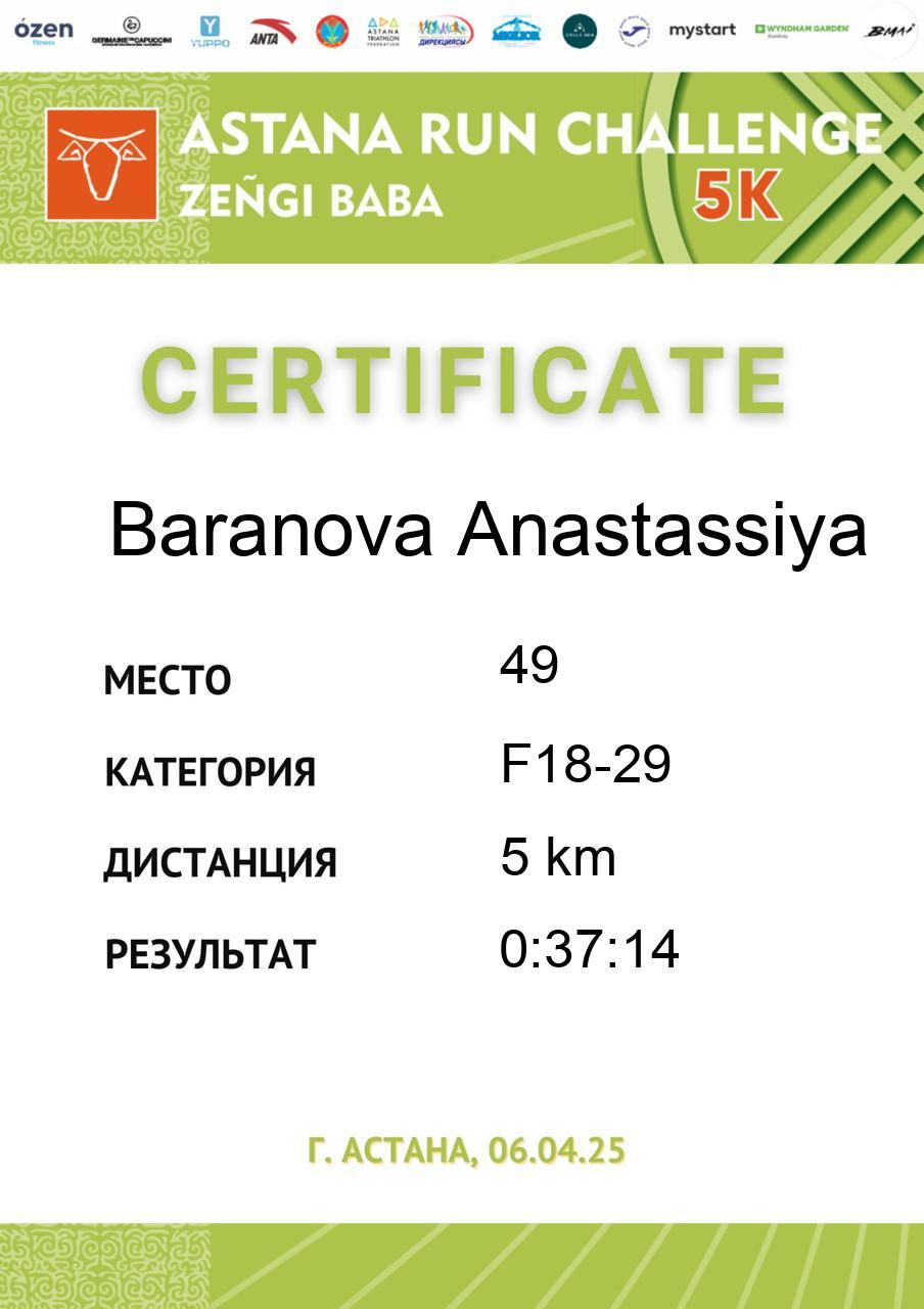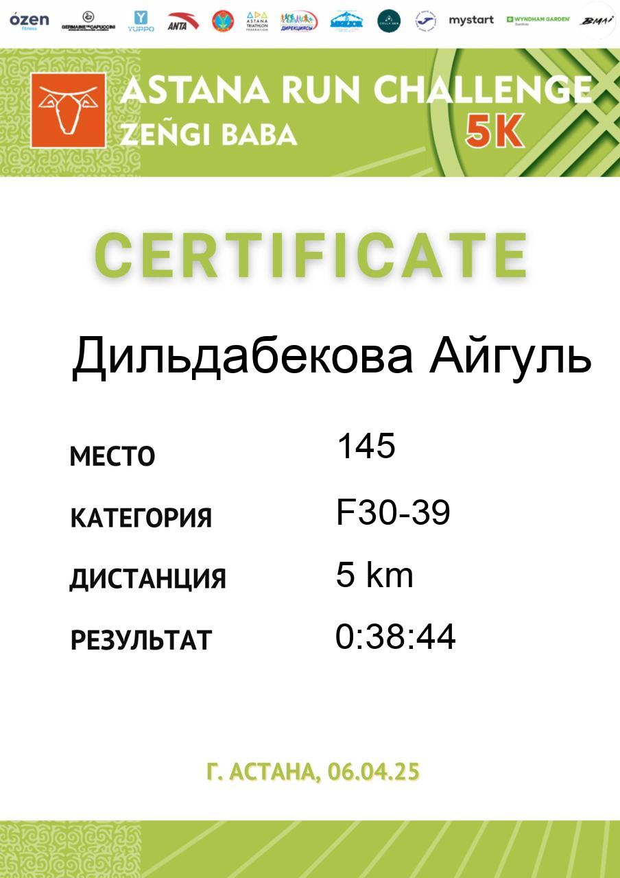 | 51 | Barakova Aigerim | 135 | F18-29 | 5 km | 0:38:07 | 745 | Скачать |