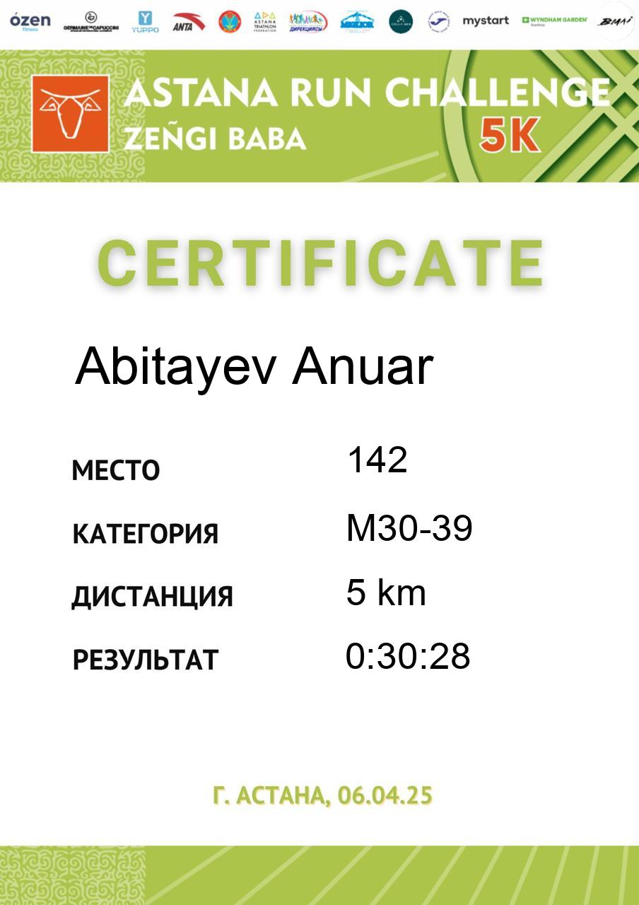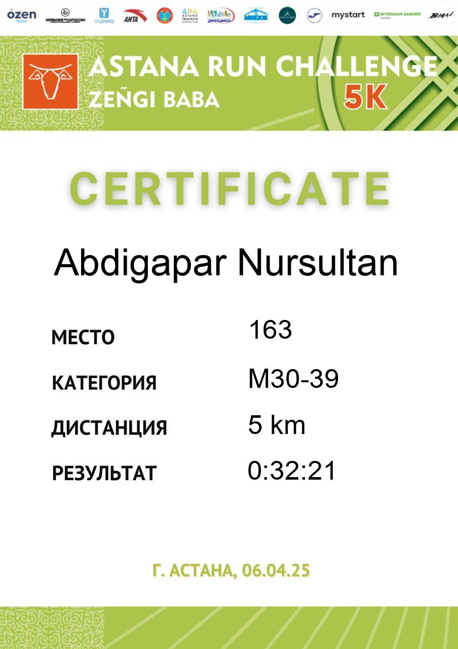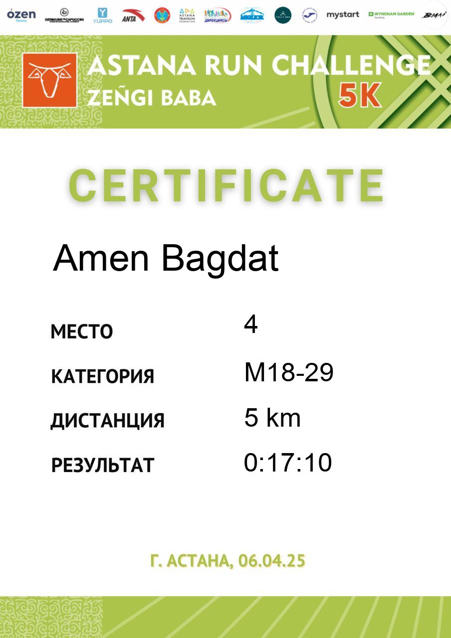 | 5 | Abdil Yerke | 4 | F18-29 | 5 km | 0:26:18 | 283 | Скачать |