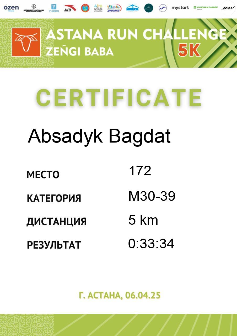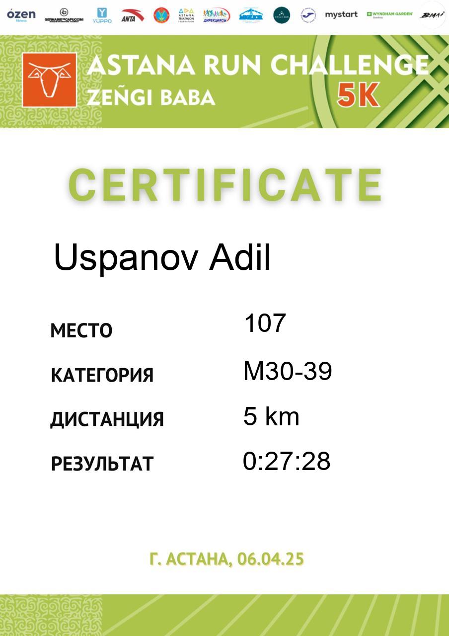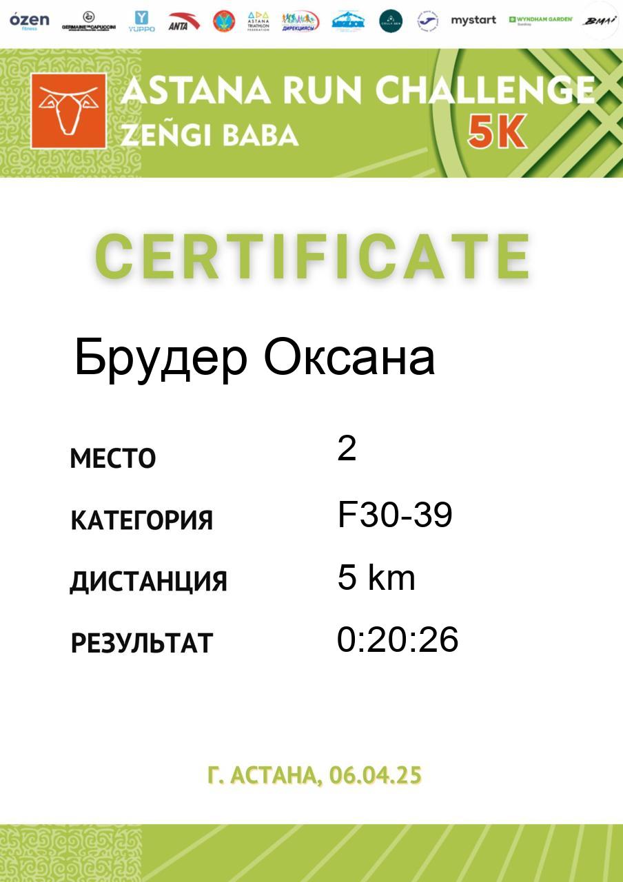 | 5 | Abdil Yerke | 4 | F18-29 | 5 km | 0:26:18 | 283 | Скачать |
