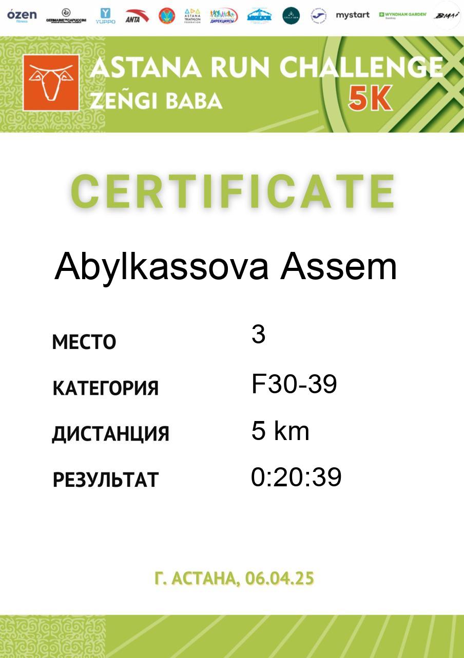 | 3 | Abylkassova Assem | 11 | F30-39 | 5 km | 0:20:39 | 66 | Скачать |
