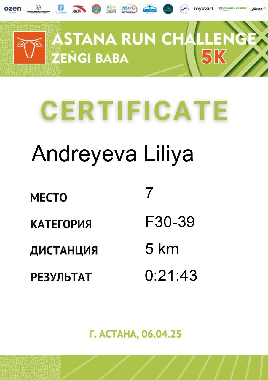 | 7 | Andreyeva Liliya | 78 | F30-39 | 5 km | 0:21:43 | 93 | Скачать |